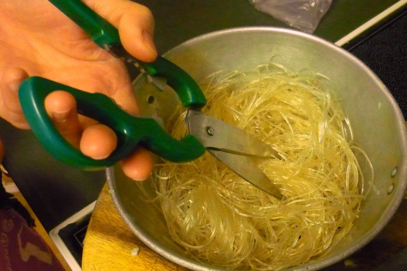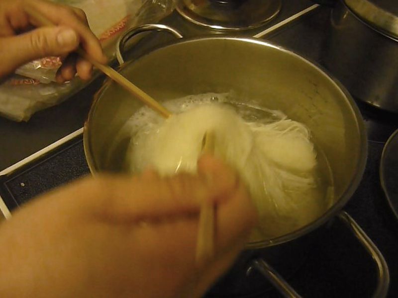 4. Die Reisnudeln werden nun aufgekocht und saugen allmählich Wasser auf. Nach dem Aufsaugen der Nudeln eine Tasse voll kaltes Wasser zukippen und weiter köcheln lassen bis sie gar gekocht sind (probiert sie am besten). Wenn sie nun fertig sind, gießt ihr nochmals kaltes Wasser hinein, damit die Nudeln nicht verkleben. Eine kleine Randbemerkung: die Reisnudeln werden beim Aufkochen weiß und die Glasnudeln bleiben immer noch durchsichtig. Beim Kauf solltet ihr ein Augenmerk darauf legen!