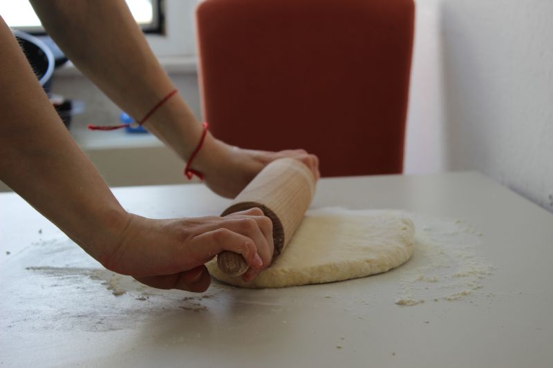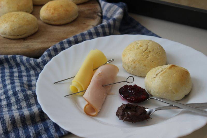 - Mehl, Backpulver, Zucker und Salz mischen, Butter in Stücken zugeben und zu einem krümeligen Teig mischen. 200 ml Milch dazugeben, zu einem glatten Teig kneten.