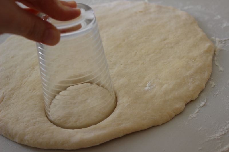 - Teig auf einer leicht bemehlten Arbeitsfläche 2 cm dick ausrollen und Kreise ausstechen (Ich habe ein Glas mit 6 cm Durchmesser genommen).