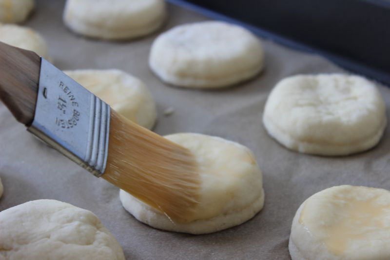 - Scones auf ein mit Backpapier ausgelegtes Backblech legen. Eigelb und restliche Milch verrühren und die Scones damit bestreichen.