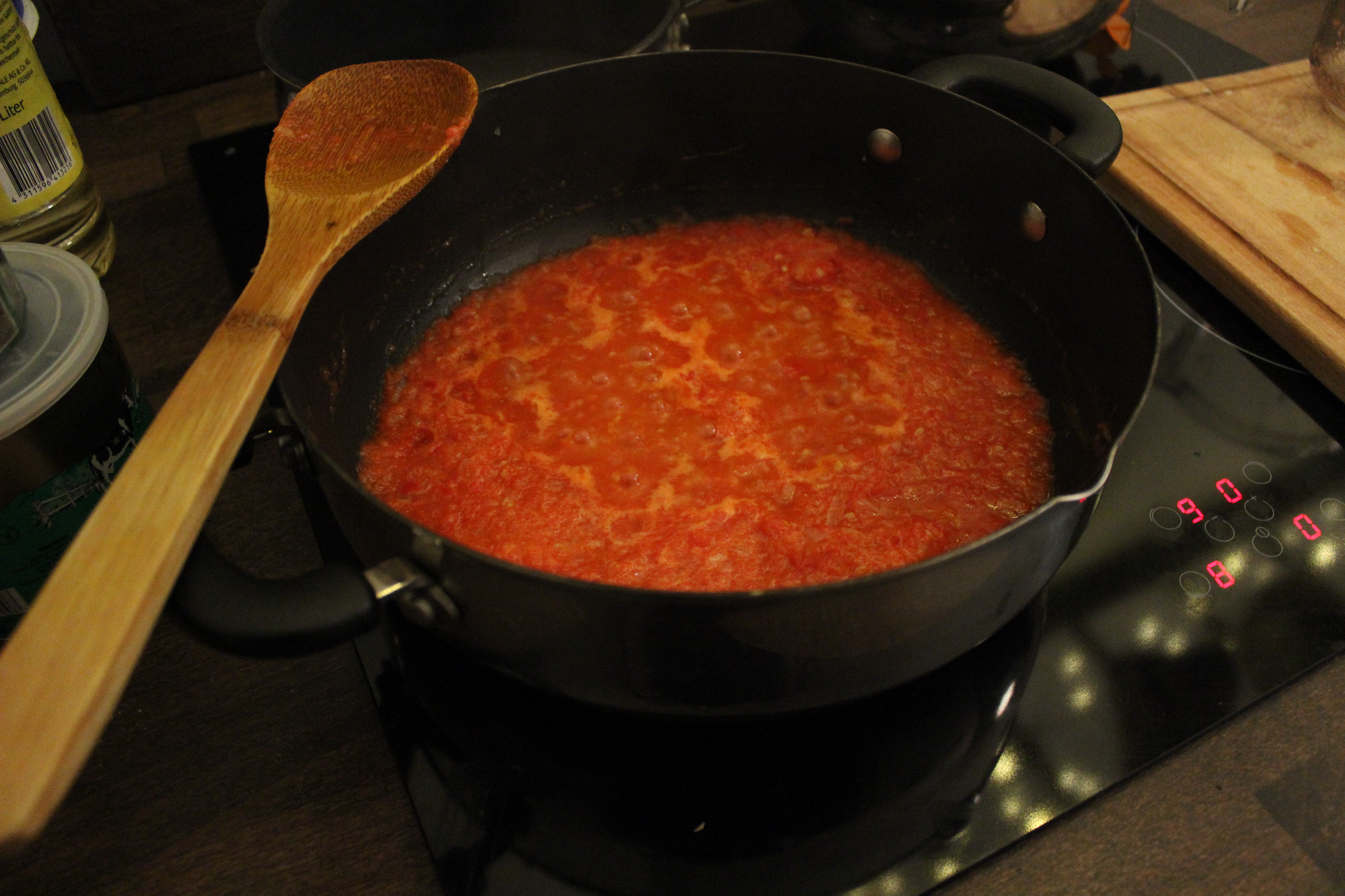 - Brühe vorbereiten: Tomaten und Paprika klein schneiden, pürieren und einige Minuten kochen, damit das austretende Wasser etwas verdampft.
