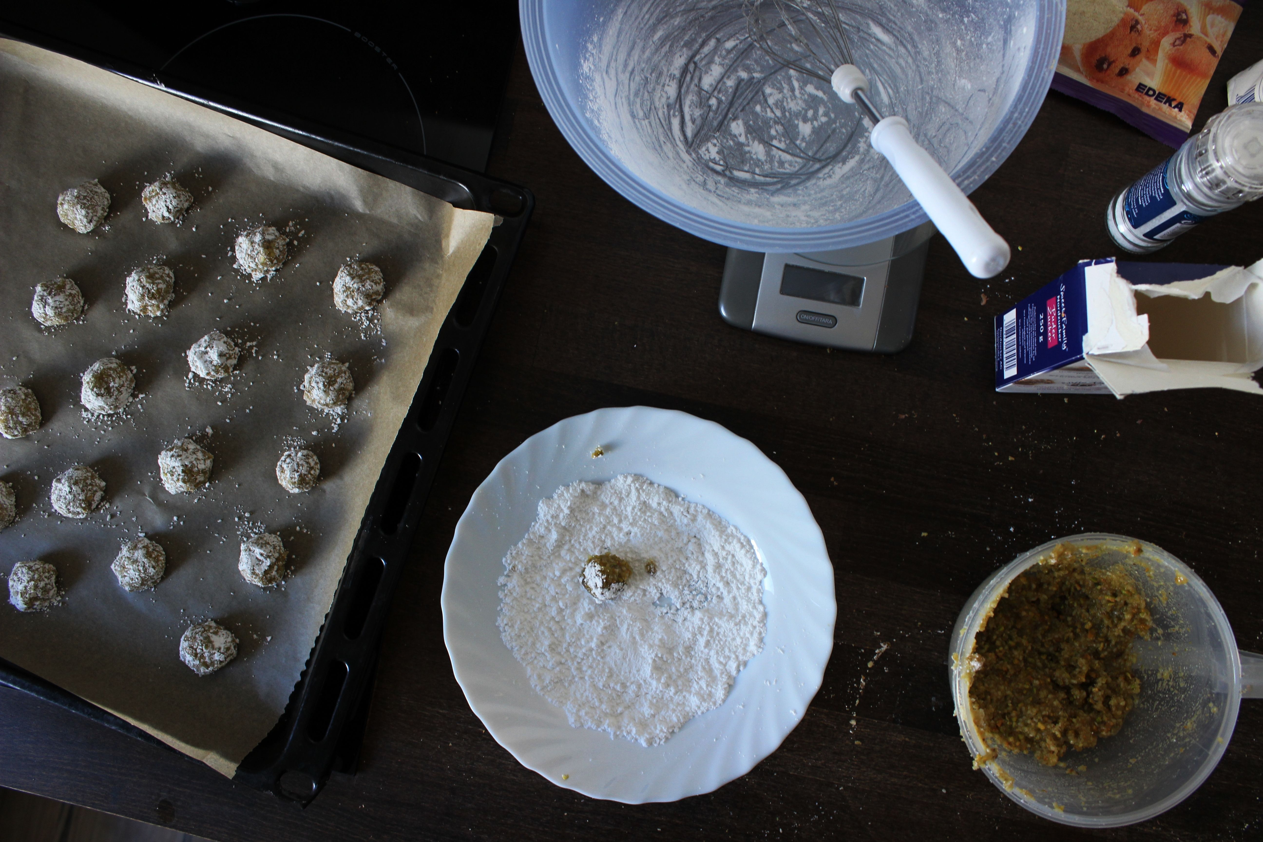 Die Kekse sind superschnell zubereitet, vorausgesetzt ihr habt fertig gemahlene Nüsse und Pistazien oder eine fixe Küchenmaschine, in der ihr sie zerkleinern könnt. Ich musste die Pistazien per Hand mahlen, das dauert natürlich etwas länger, lohnt sich aber!