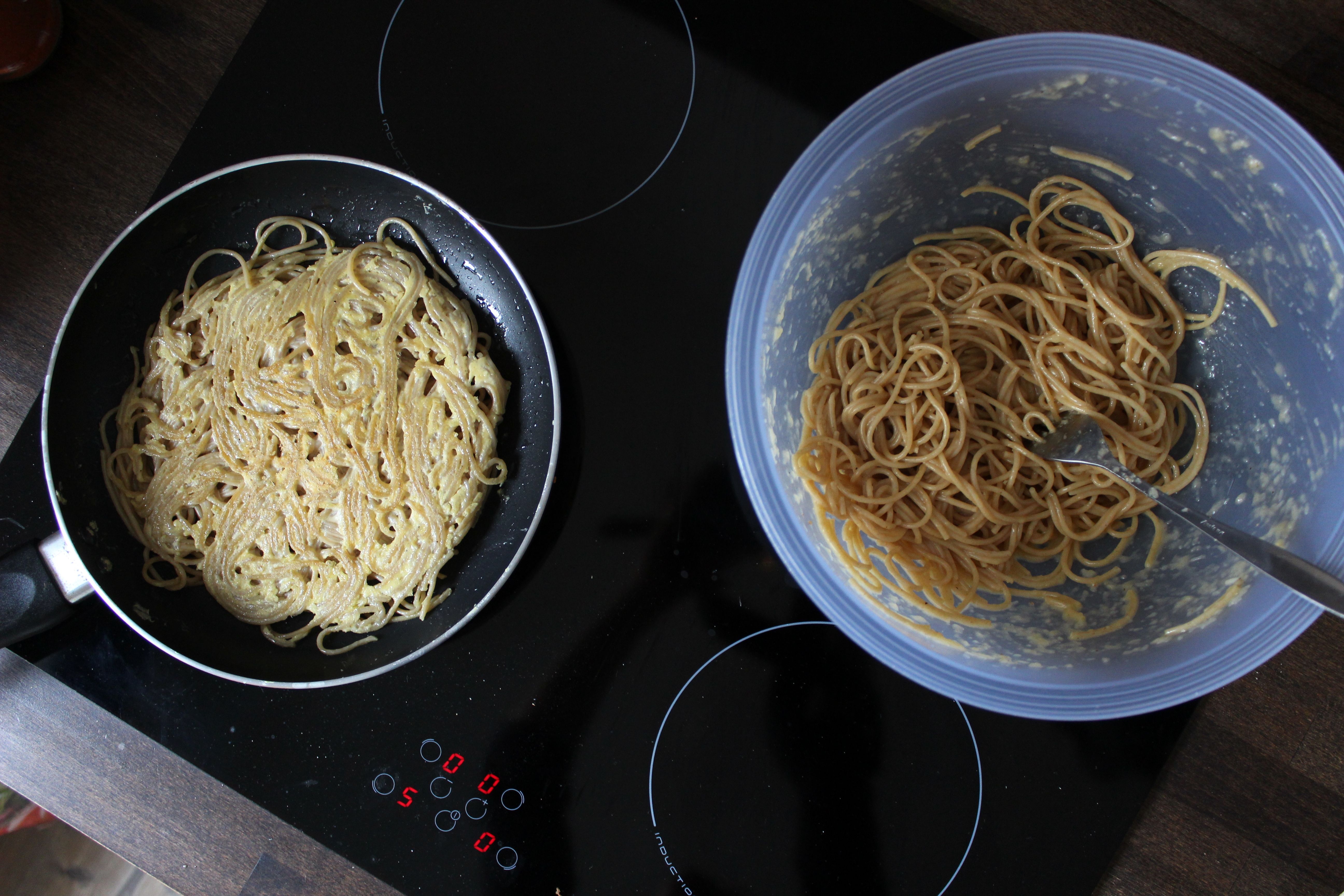 - Eier in einer großen Schüssel schlagen, Käse unterrühren, mit Pfeffer, Salz und Muskanuss würzen. Spaghetti hinzugeben und alles gut vermengen.