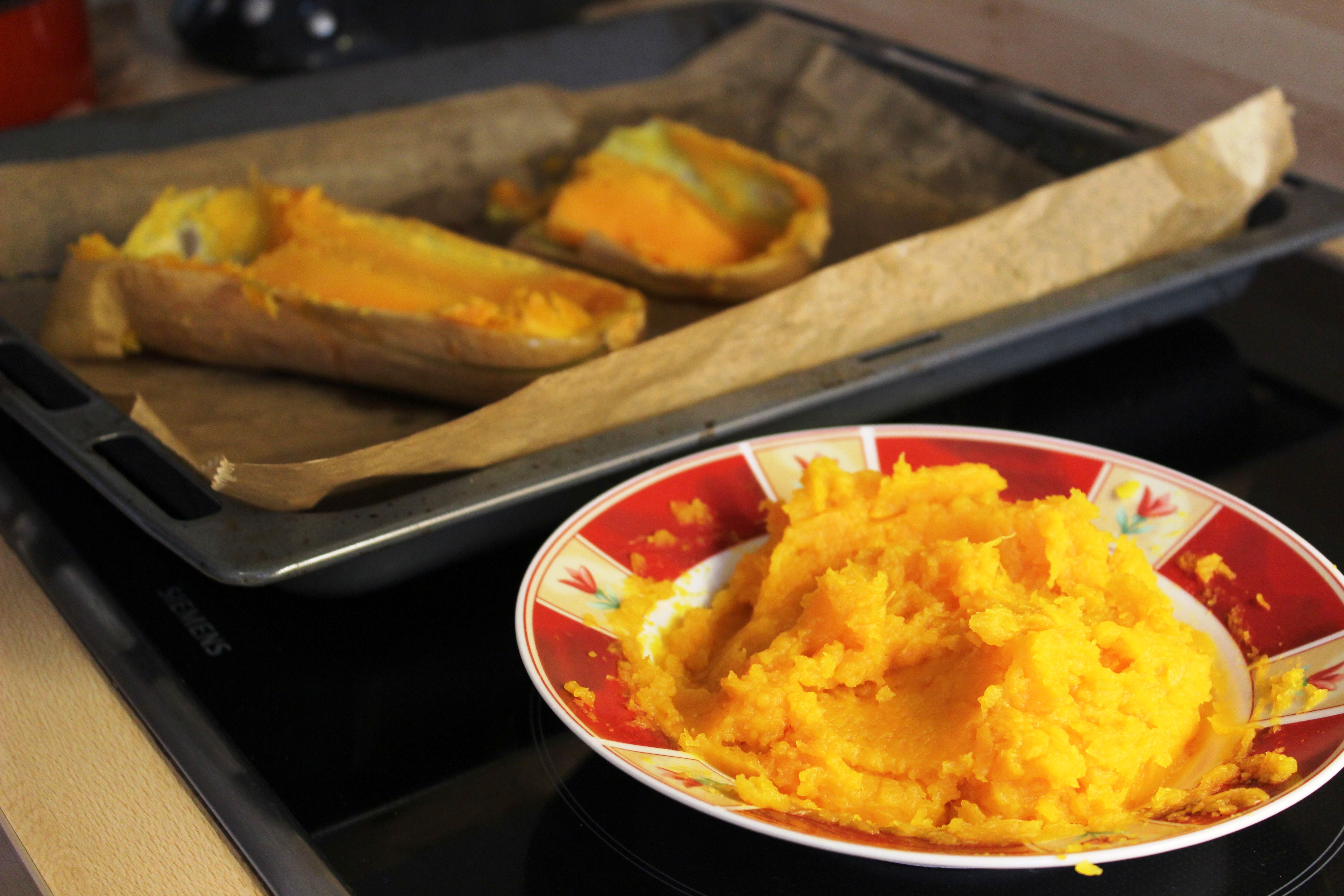 - Für das Kürbispüree: Den Kürbis längs halbieren, von Kernen befreien, die offene Seite mit etwas Olivenöl bestreichen und mit der Schnittseite nach unten auf einem Backblech etwa 45 min. bei 180 Grad backen. Die Haut wird schrumpelig und das Kürbisfleisch sollte weich genug sein, sodass ihr es ohne viel Mühe mit einem Löffel herausnehmen könnt. Je nach Konsistenz reicht es dann, das Fleisch mit einer Gabel zu zerdrücken, alternativ könnt ihr es bestimmt auch im Standmixer pürieren. Dann das Püree abkühlen lassen.