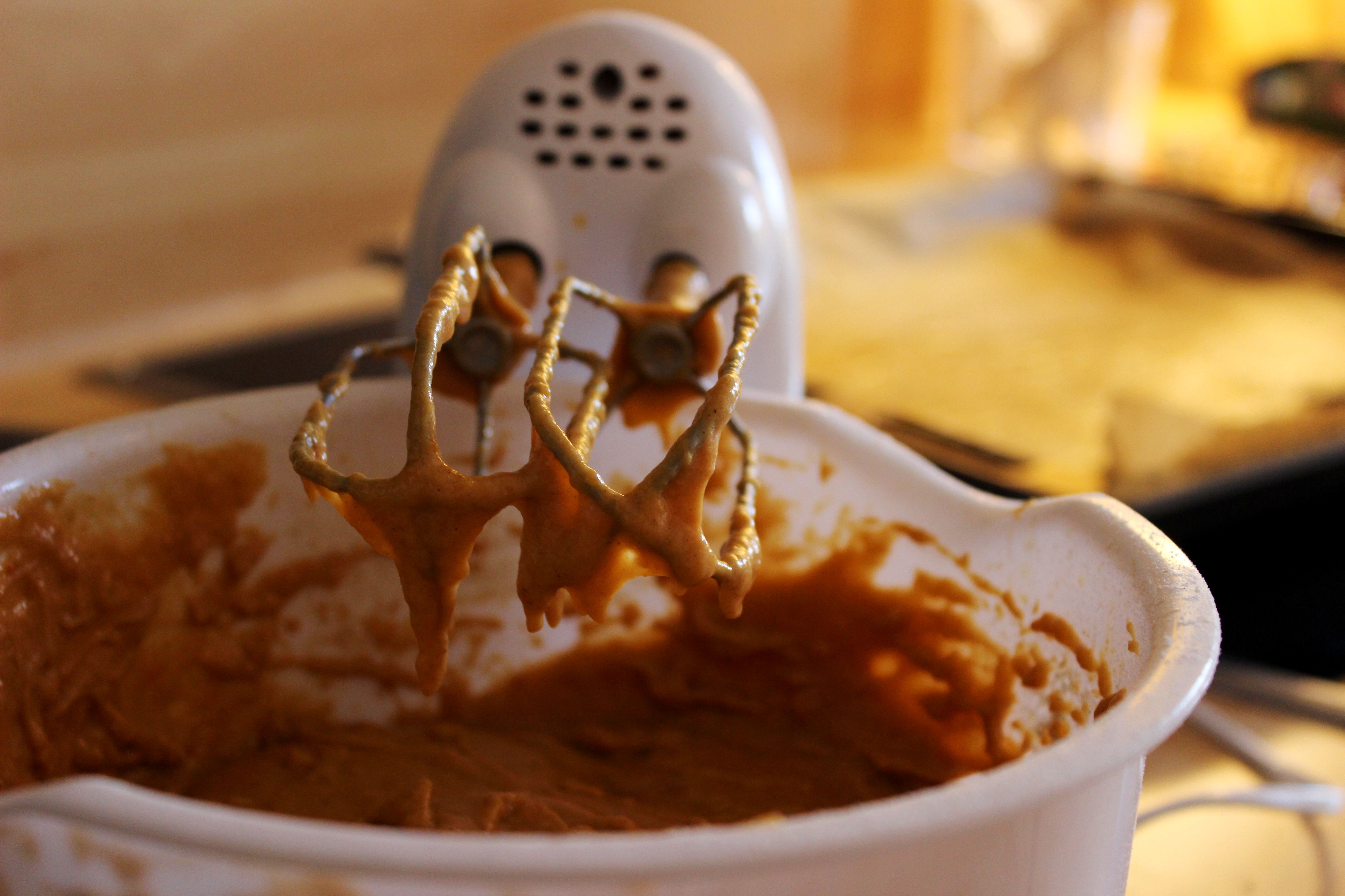 - In einer anderen Schüssel Zucker, Sirup und Butter schaumig schlagen, dann zunächst die Eier, dann das Kürbispüree, das Mehl und zuletzt die Walnüsse hinzufügen und unterrühren.
