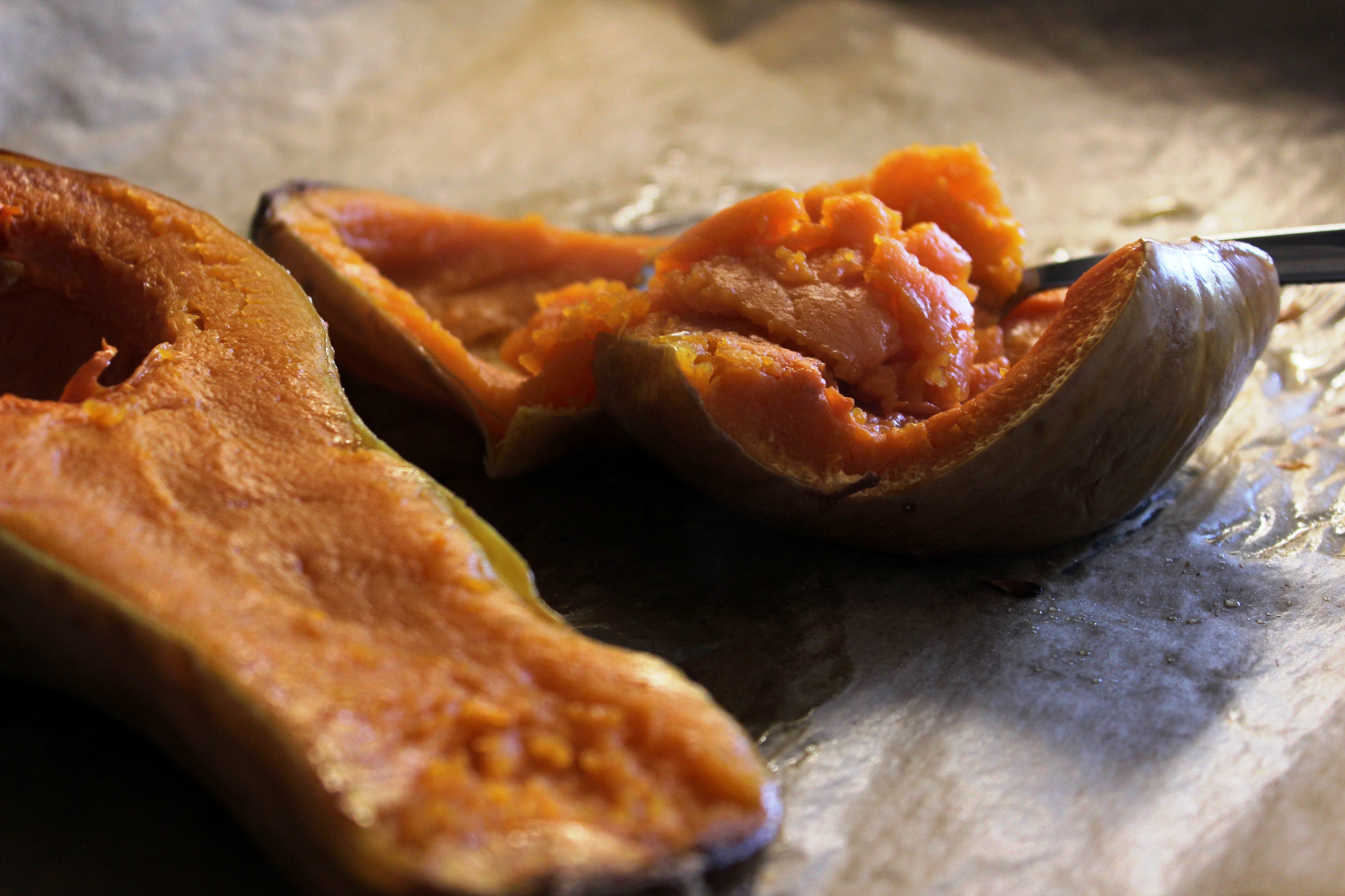 - Butternut längs halbieren, entkernen, die offene Seite mit etwas Öl bestreichen und mit der Schnittseite nach unten auf einem Backblech etwa 45 min. bei 180 Grad backen. Das weiche Kürbisfleisch pürieren und abkühlen lassen.