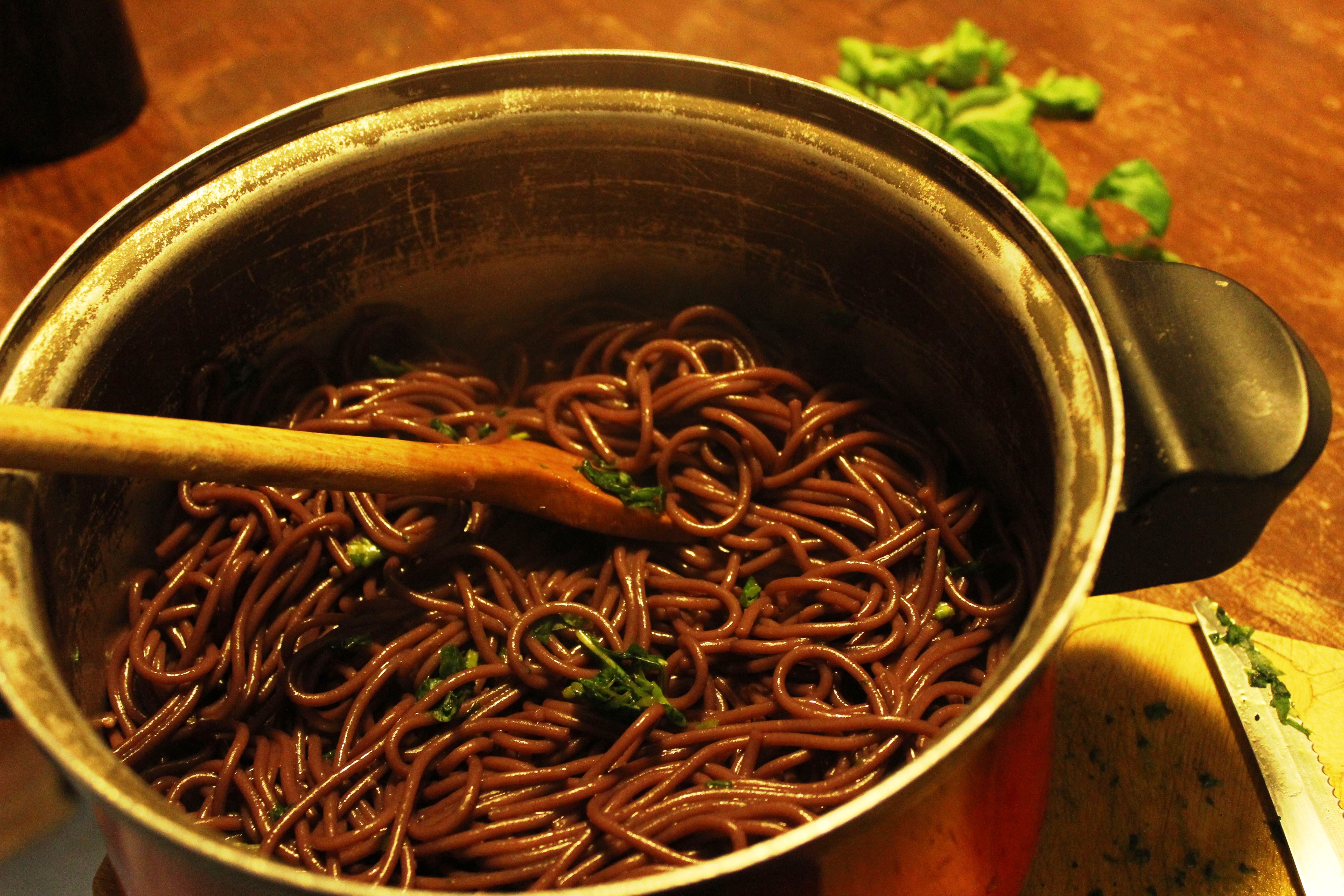 - Die Spaghetti hinzugeben, salzen und 8 bis 10 Minuten köcheln lassen, bis der Rotwein vollständig von den Spaghetti aufgesogen worden ist. Mit Salz und Pfeffer abschmecken.