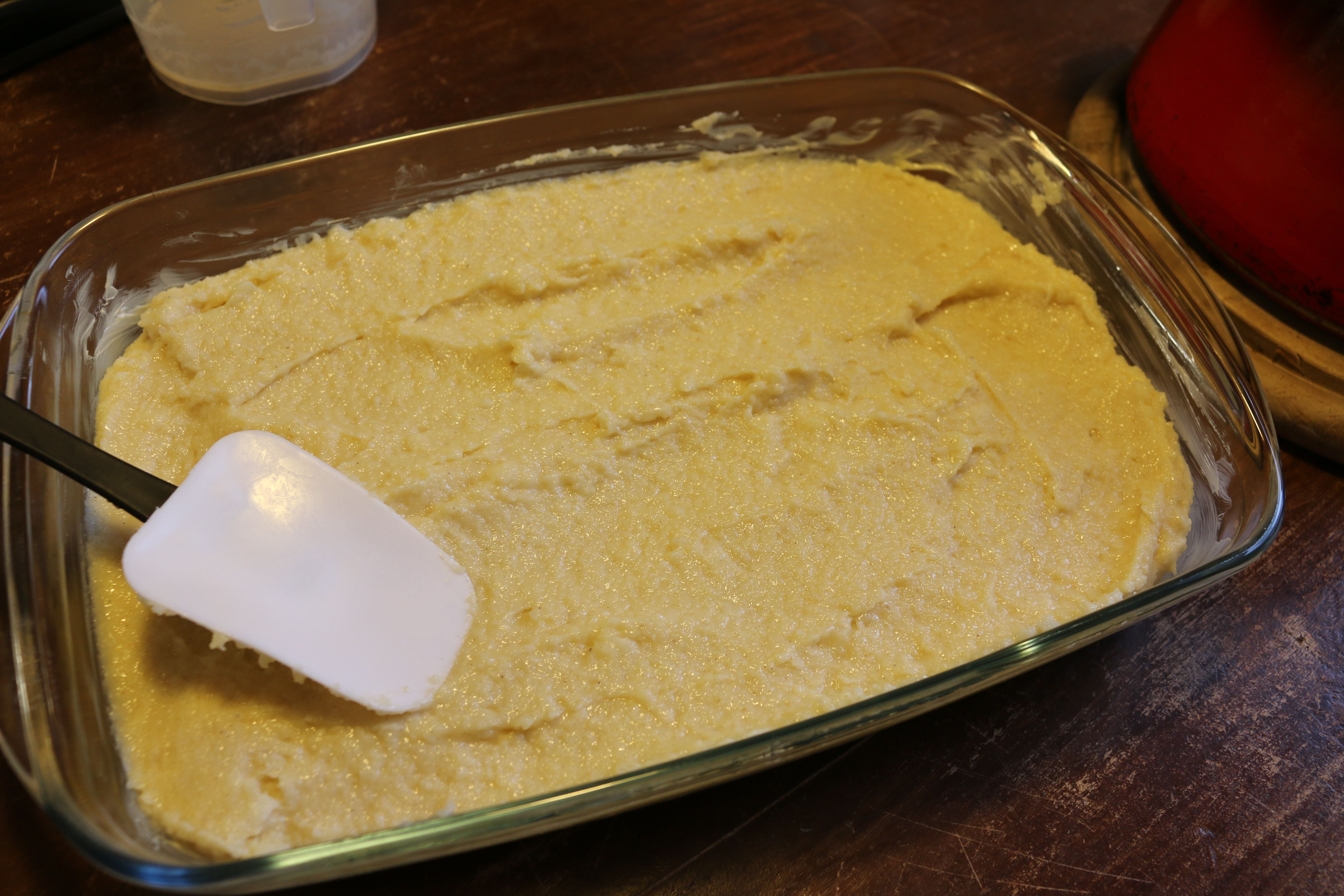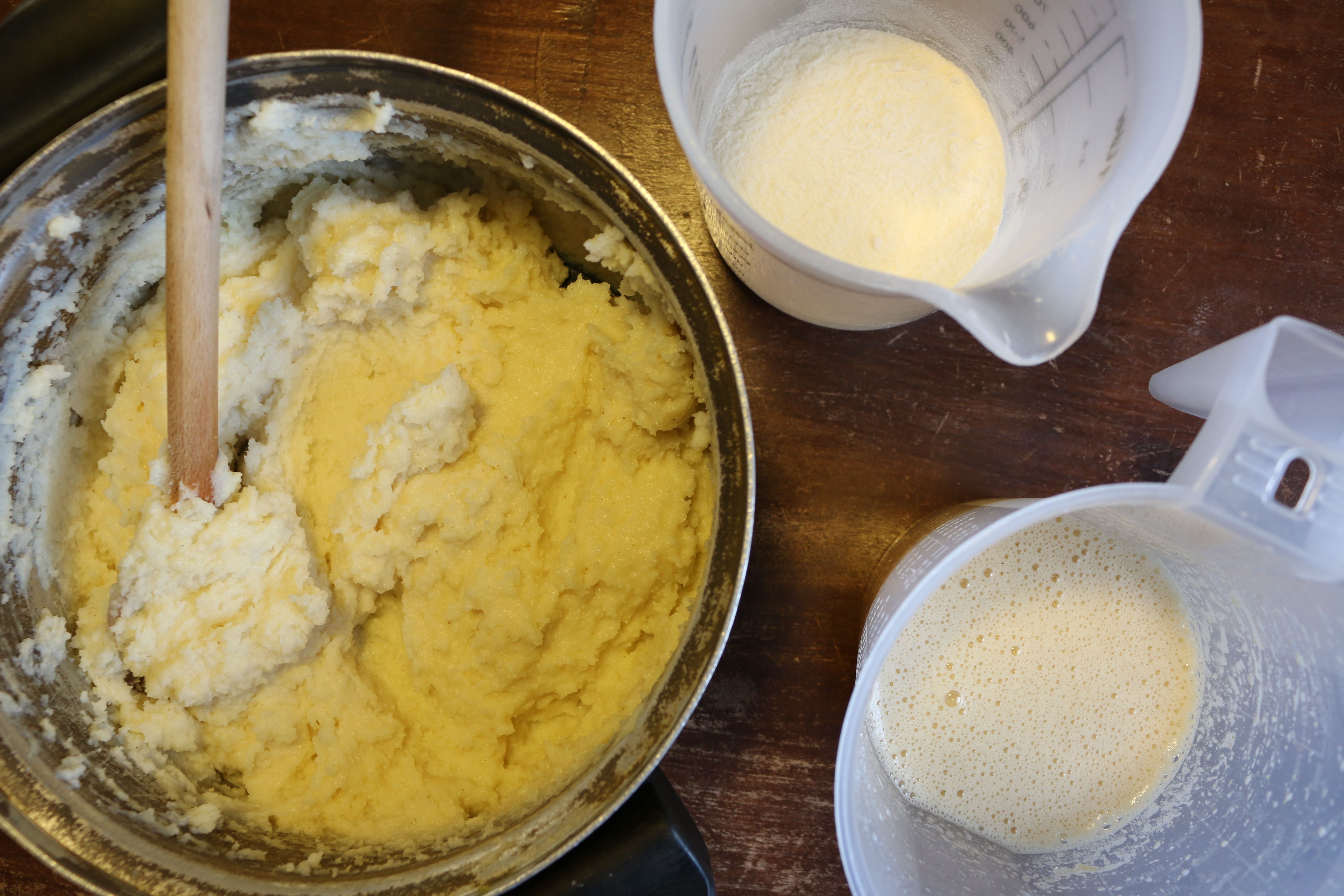 - Eier, Zucker, Salz und Kardamom vermixen und zusammen mit dem Mehl unter den Grießbrei rühren.