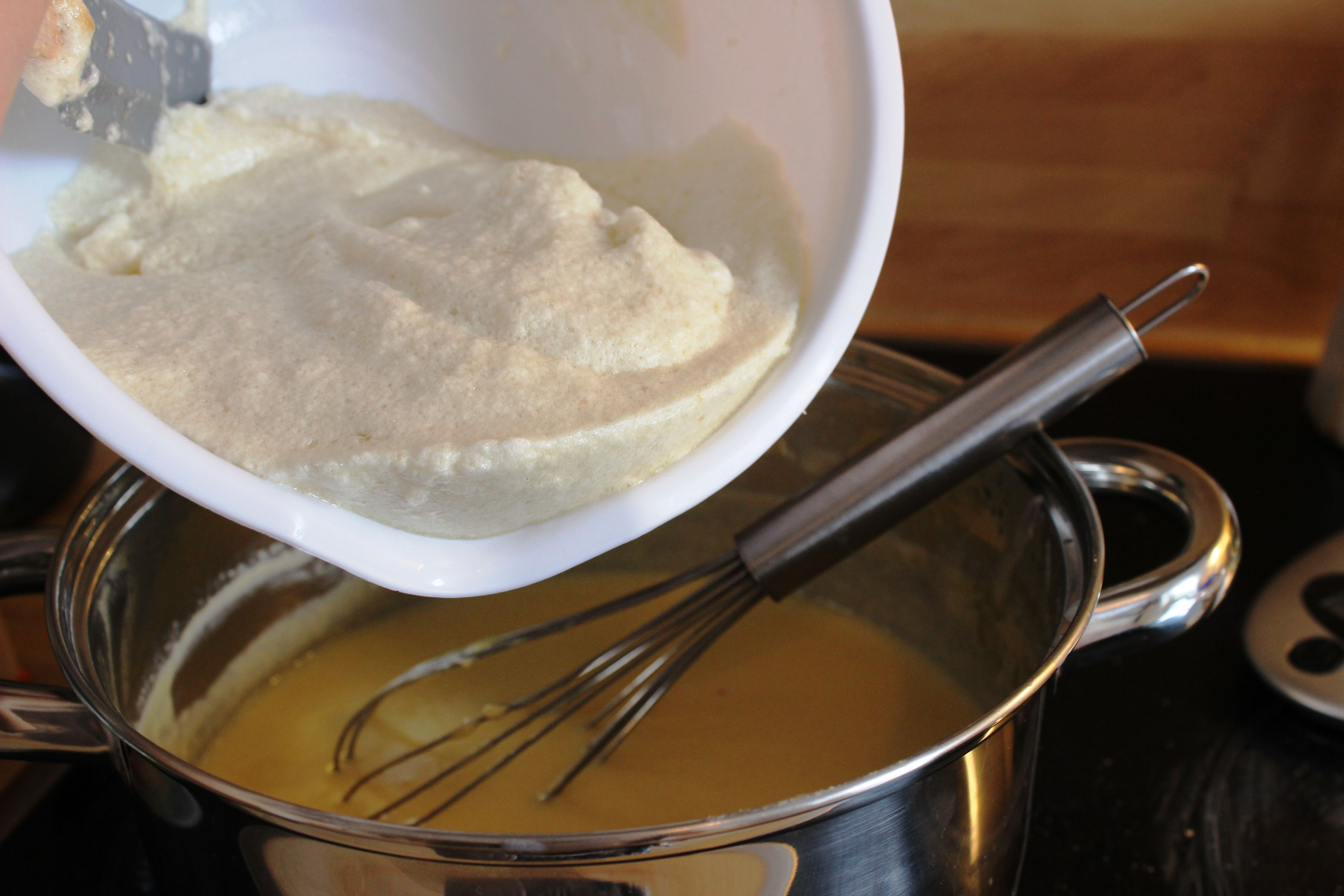- Die Eier trennen. Eiweiß steif schlagen und die restlichen 75 g Zucker unterheben. Eigelb cremig rühren, in die Milch-Mehl-Mischung rühren und Mandelaroma hinzufügen. Den Eischnee vorsichtig unterheben.