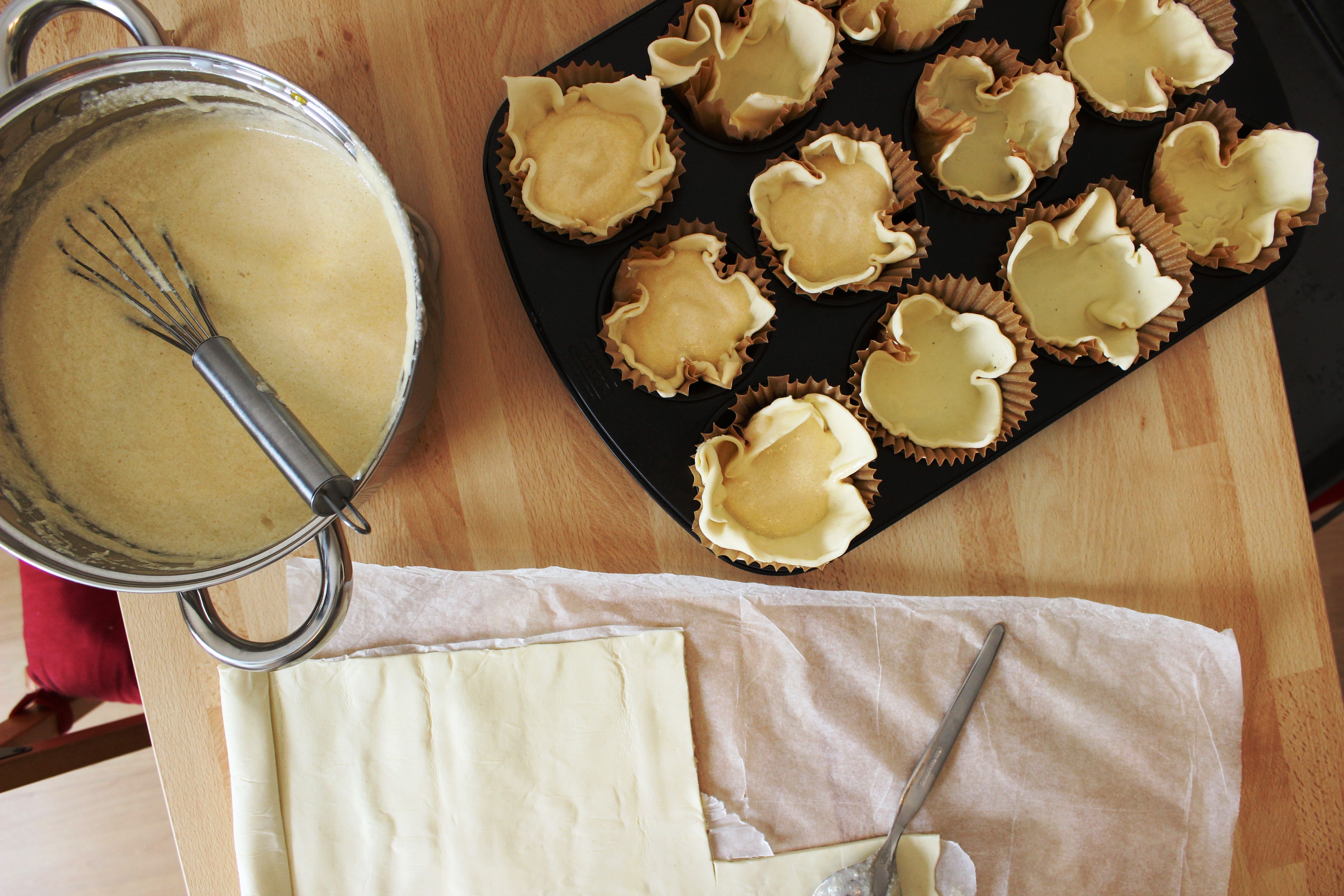 Melktert bezeichnet eine Art Puddingkuchen, der aus einem Boden und einer luftig-cremigen Füllung besteht. Ursprünglich haben holländische Siedler das Rezept wohl nach Südafrika gebracht, wo es heute ein beliebtes Dessert ist. In fast allen Rezepten, die ich im Internet gefunden habe, wird Blätterteig für den Boden verwendet und ich habe mich ebenfalls für diese Variante entschieden. Ihr könnt natürlich auch selbst einen Teig herstellen. Dabei solltet ihr beachten, dass er schön geschmeidig ist, sodass ihr einen Rand formen könnt. Idealerweise wird die „Milk Tart“ in einer Tarteform gebacken. Ich habe mich dieses Mal für mehrere kleine Muffinförmchen entschieden.