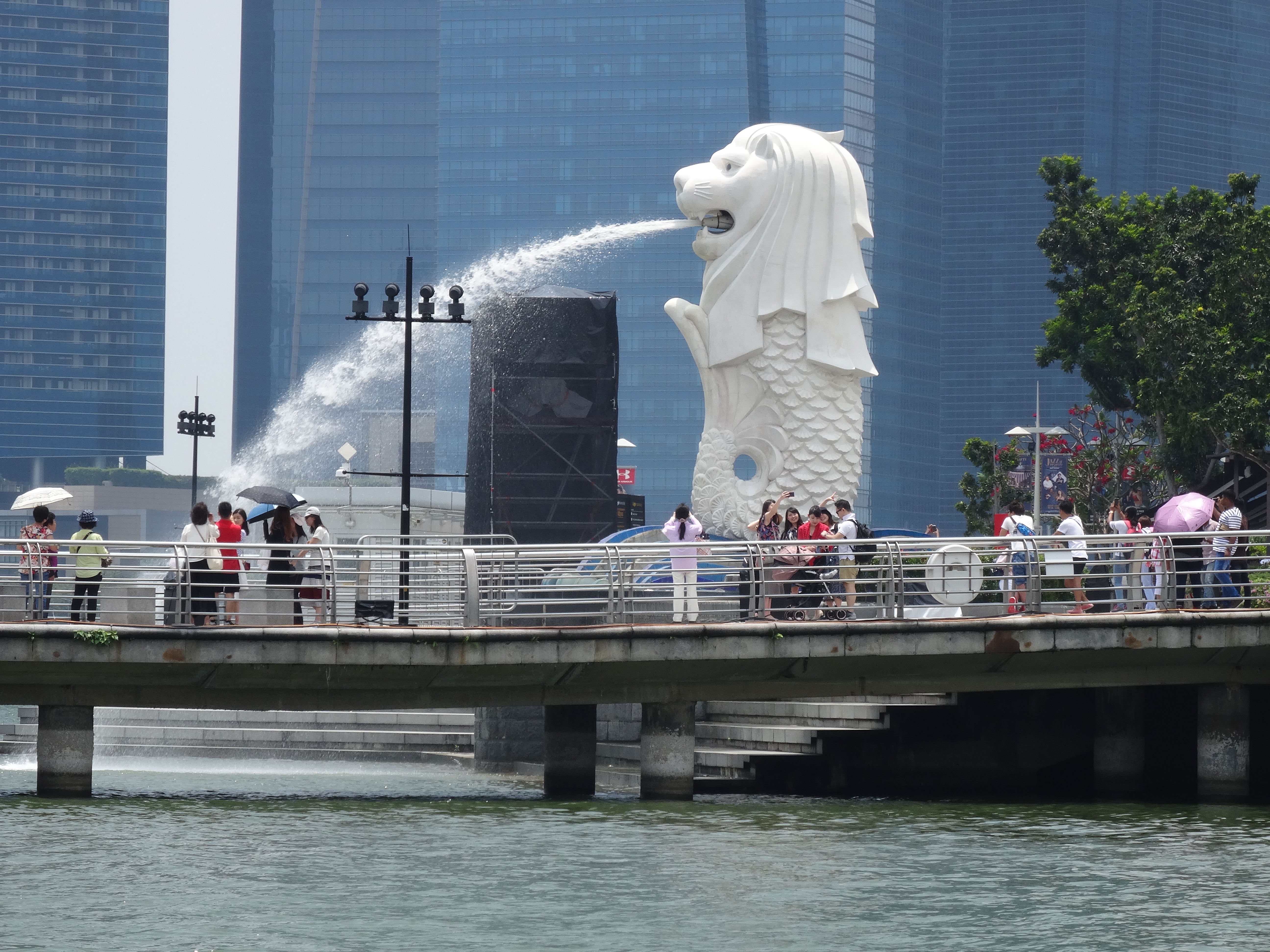 Für Tag zwei hatten wir uns als erstes Ziel die armenische Kirche auserkoren, das erste Steingebäude Singapurs, erbaut 1835. Bereits auf dem Weg dorthin brannte uns die Sonne auf die mangelhaft geschützten Nacken und Nasen. Generell lässt sich zum Klima sagen: Nachts kühlt es kaum unter 30°C ab und die Luftfeuchtigkeit ist genauso ambitioniert wie die ganzen Geschäftsleute und gibt fast immer 100 %. Unser Weg führte uns weiter am Dalhousie Obelisk und an der Victoria Theatre & Concert Hall vorbei, über die Anderson Bridge und durch den Schatten des beeindruckenden Fullerton Hotels. Bis hin zur letzten großen Kreuzung vor den Meerlöwen – alte Wahrzeichen Singapurs, ein Zwischending aus Simba und Arielle. An jeder Kreuzung wird übrigens mit Hilfe von ausführlichen Zeichnungen darum gebeten, vor dem Überqueren der Straße doch auf den „Green Man“ zu warten. Welcher sich dann mit einem freudigen Laser-Schießgeräusch ankündigt und fortan die Grünphase mit einem rhythmischen Glucksen begleitet.