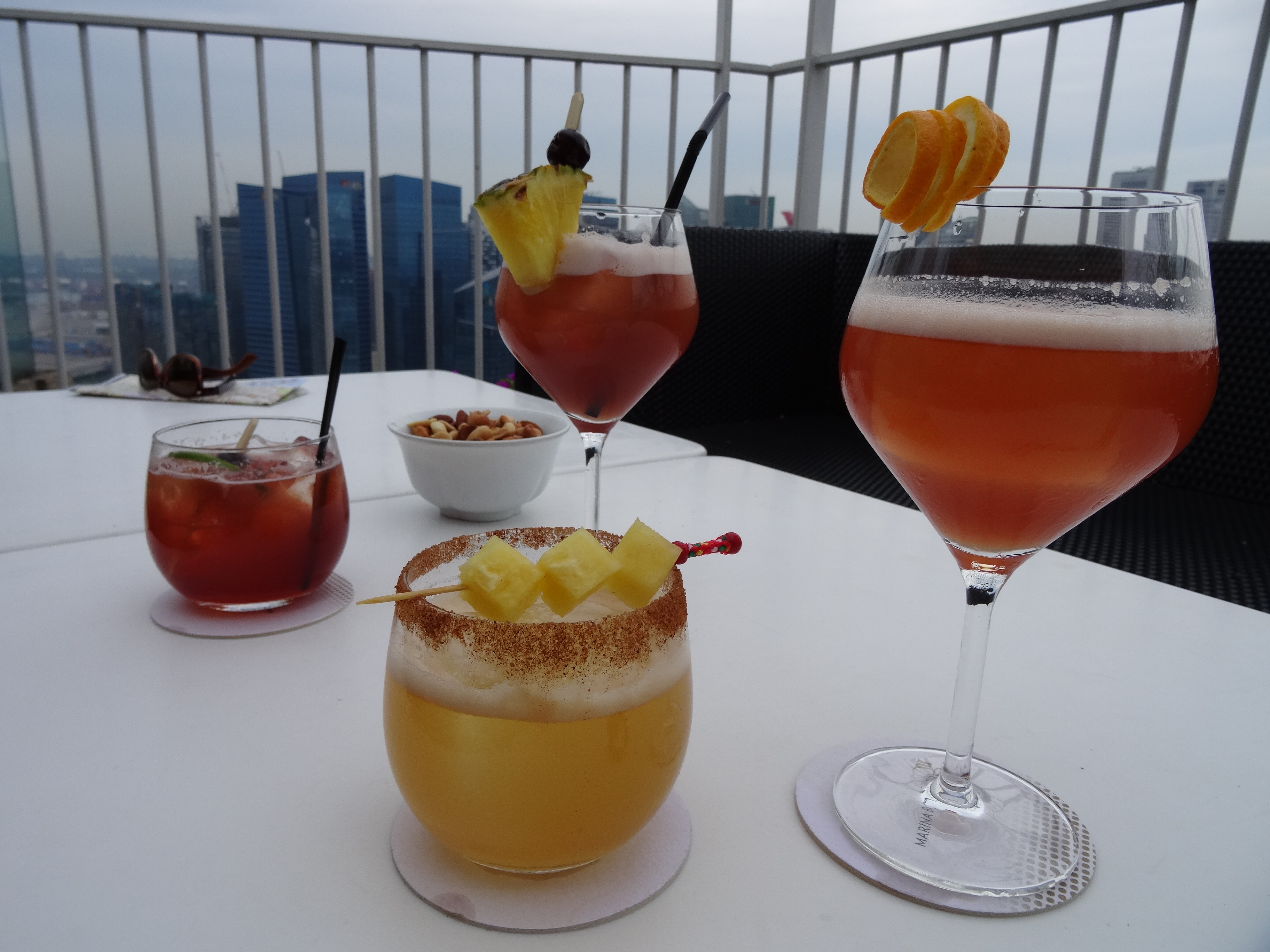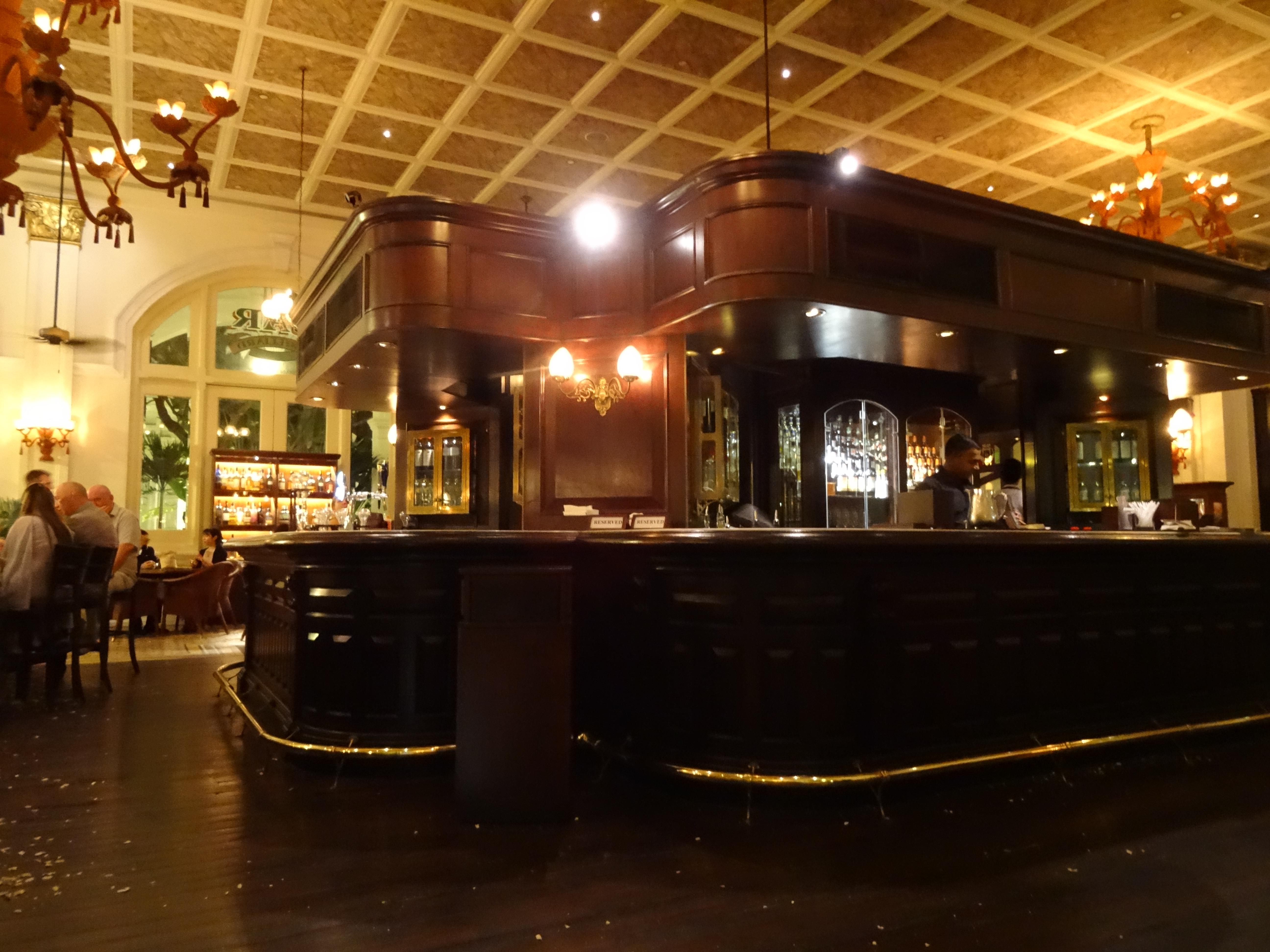 Als luxuriösen Höhepunkt des letzten Abends hatten wir uns vorgenommen, im ältesten Hotel der Stadt, dem Raffles, Geburtsstätte des Singapore Sling, einen solchen zu trinken. Der schicken Atmosphäre in der Hotelbar zollten wir mit langen Hosenbeinen Respekt, während die Unmengen an Erdnussschalen auf dem Boden unseren guten Willen fast ein wenig verhöhnten. Trotz allem Schickimicki wirft man hier die Schalen der Nüsse, die man kostenlos zum Getränk bekommt, sorglos auf den Boden. Geschmacklich waren die drei Sling-Varianten sowie der Cosmopolitan nicht die Krone der Schöpfung, aber man muss es mal gemacht haben und dafür hatten wir hier mit Abstand die freundlichste Bedienung der ganzen Stadt erwischt.