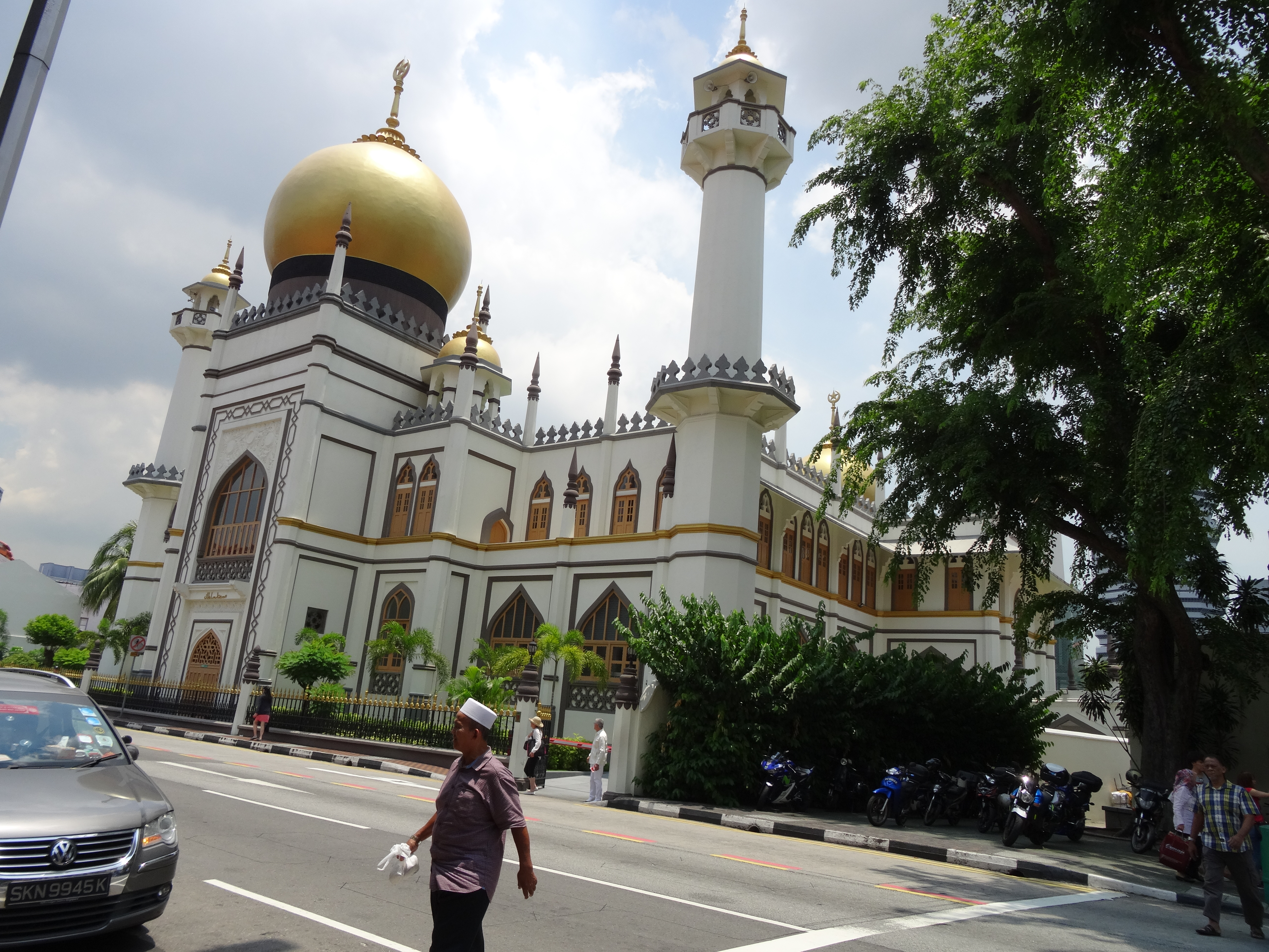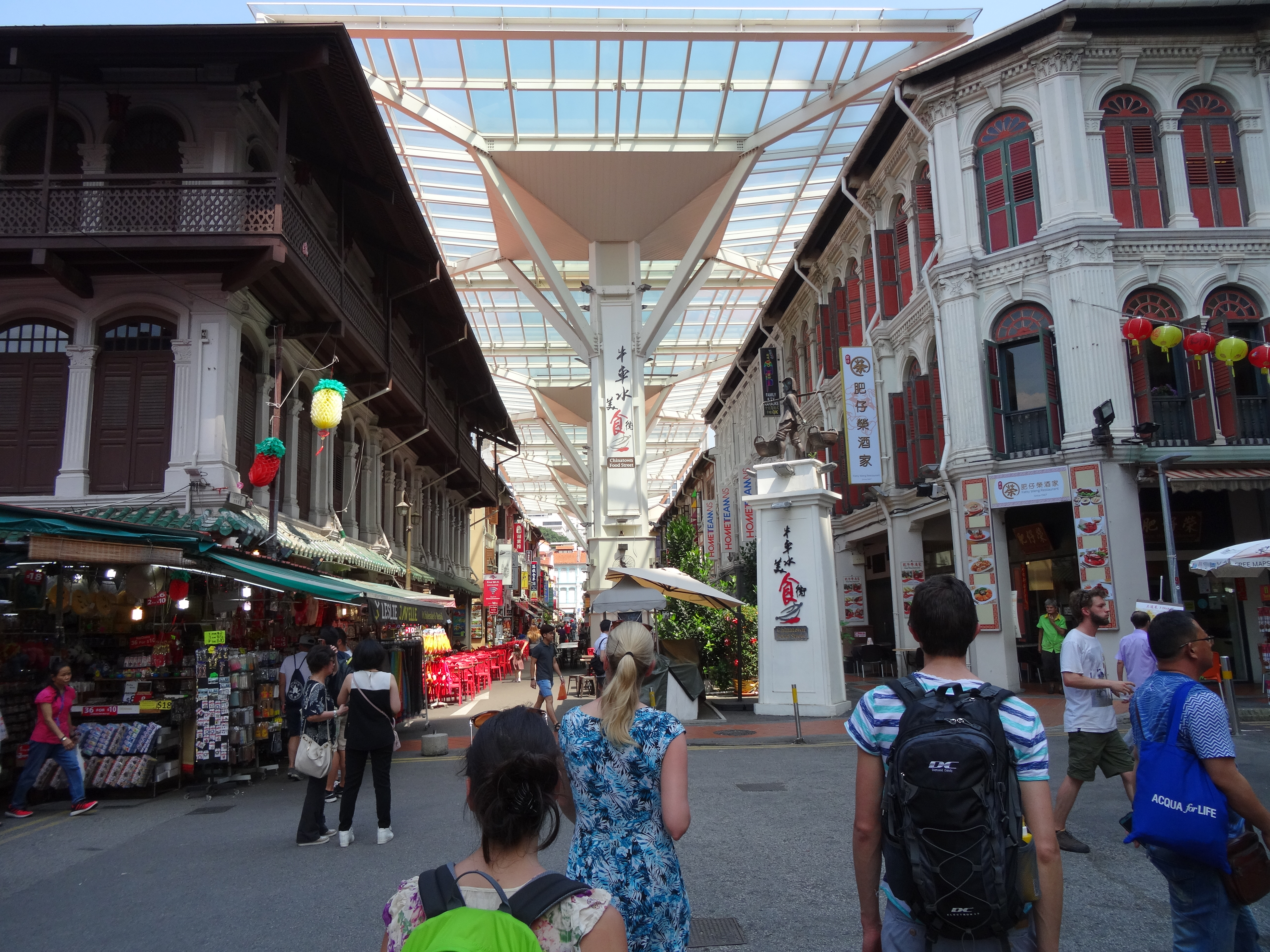 Am dritten Tag standen Little India und Chinatown auf dem Plan. Obwohl uns die Hitze zu schaffen machte, bissen wir die Zähne zusammen und wanderten durch die unterschiedlichsten Stadtviertel. Unterwegs staunten wir über üppig bepflanzte Hochhäuser und betraten als letzte Etappe das chinesische Viertel. Ein Fußgängerüberweg führte uns über die Straße mitten in eine Art Basar, aus dem wir erst wieder einen Ausweg suchen mussten, bevor wir einen örtlichen Supermarkt besuchten. Wir schlenderten durch die Gänge, in denen allerlei Gaumenschmäuse zum Verkauf feilgeboten waren, etwa getrocknete Haifischflossen oder sonstige fischige Widerlichkeiten. Im Anschluss besichtigten wir einen hinduistischen Tempel, den Sri Mariamman Temple. Den Damen wurden knie- und schulterbedeckende Tücher gereicht, Schuhe mussten draußen bleiben.