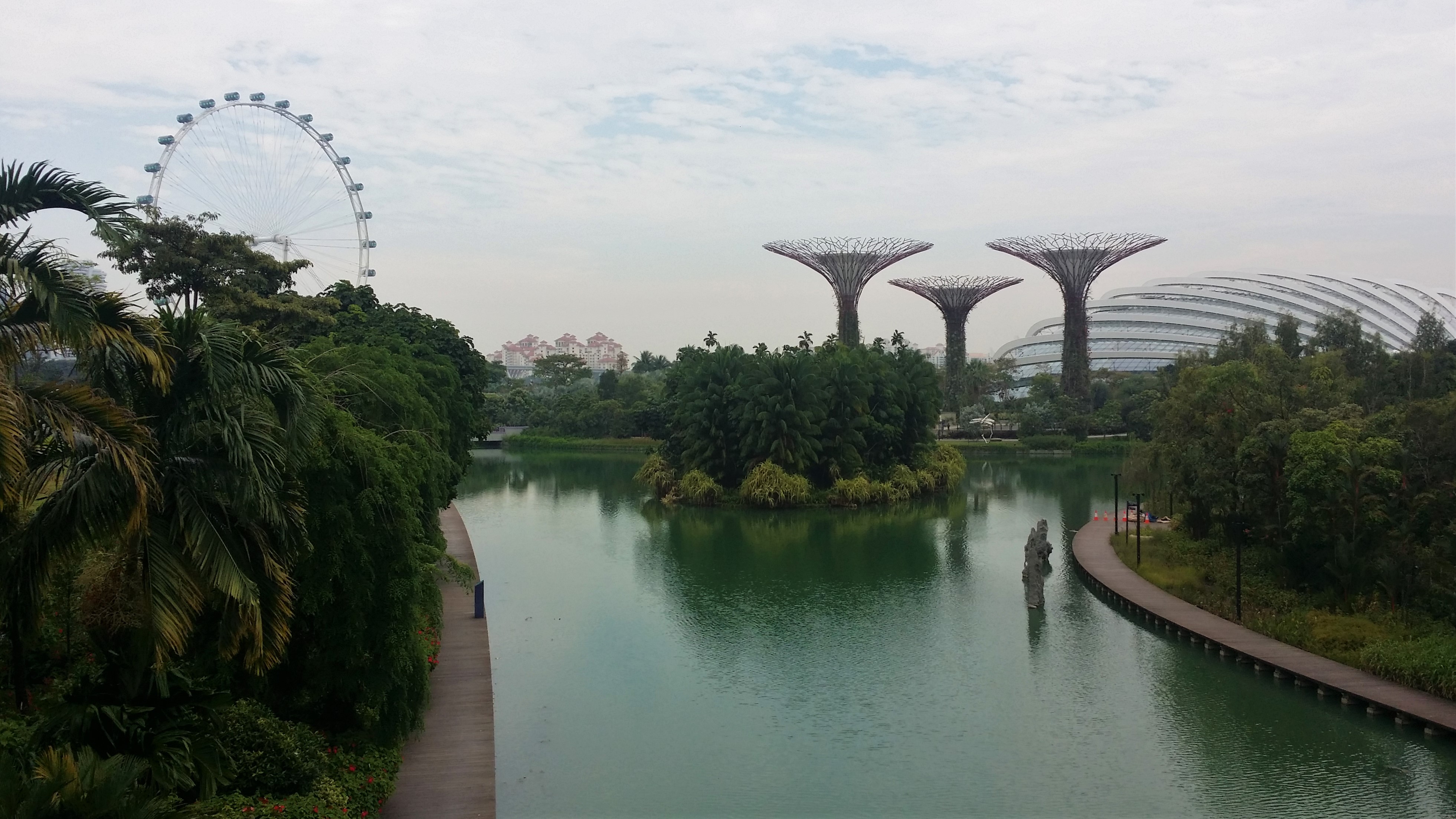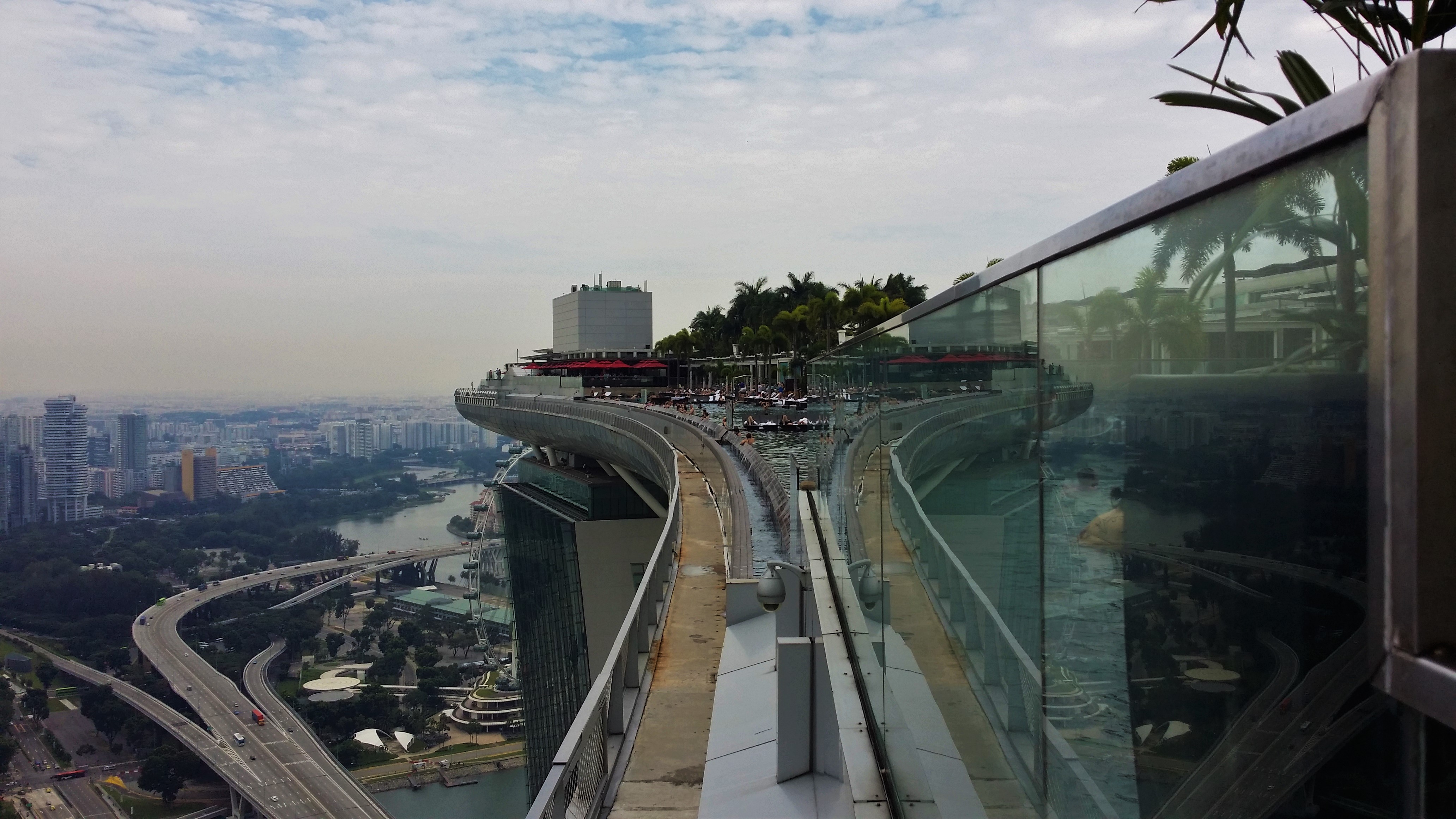 Weiter ging es am Ufer entlang und zwischen Häuserschluchten hindurch ins Marina Bay Sands, dem neuen Wahrzeichen Singapurs. Das imposante Hotel ist einigen vielleicht schon als typisches Postkarten-Motiv bekannt. Die beeindruckende Architektur und die gewaltige Lobby sind auf jeden Fall einen Besuch wert. Wir stiegen kurzerhand in einen Fahrstuhl, der uns bis nach oben in den 57. Stock brachte, runde 200 Meter über dem Meeresspiegel. Zum eigentlichen Wunschziel, dem Infinity Pool, kamen wir nicht. Vielleicht hätten wir unsere Idee, die Schmiere stehende Hotelangestellte zu schmieren, in die Tat umsetzen sollen. Nichtsdestotrotz kann man von oben eine fantastische Aussicht genießen und den ein oder anderen sündhaft teuren Cocktail schlürfen, während man den Blick über die Skyline der Stadt schweifen lässt. Wieder unten, gelangten wir durch Schleichwege auf der Rückseite des Hotels in die Marina Bay Gardens, eine Art Parkanlage der Superlative mit dutzende Meter hohen, künstlichen Bäumen.