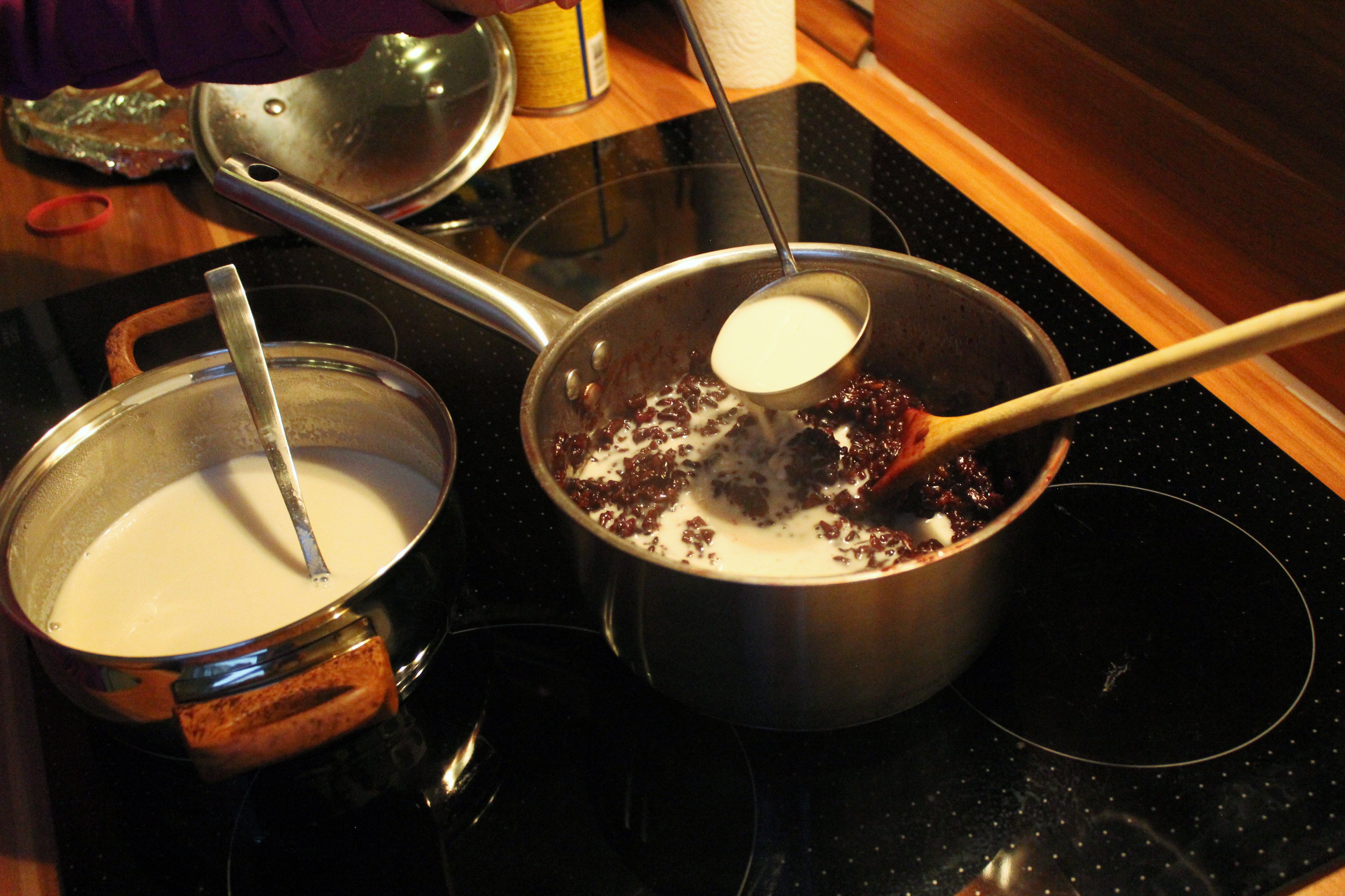 - Bei geringer Hitze etwa die Hälfte der Kokosmilch zum Reis geben und gut vermengen. Es sollte eine klebrige Masse entstehen.