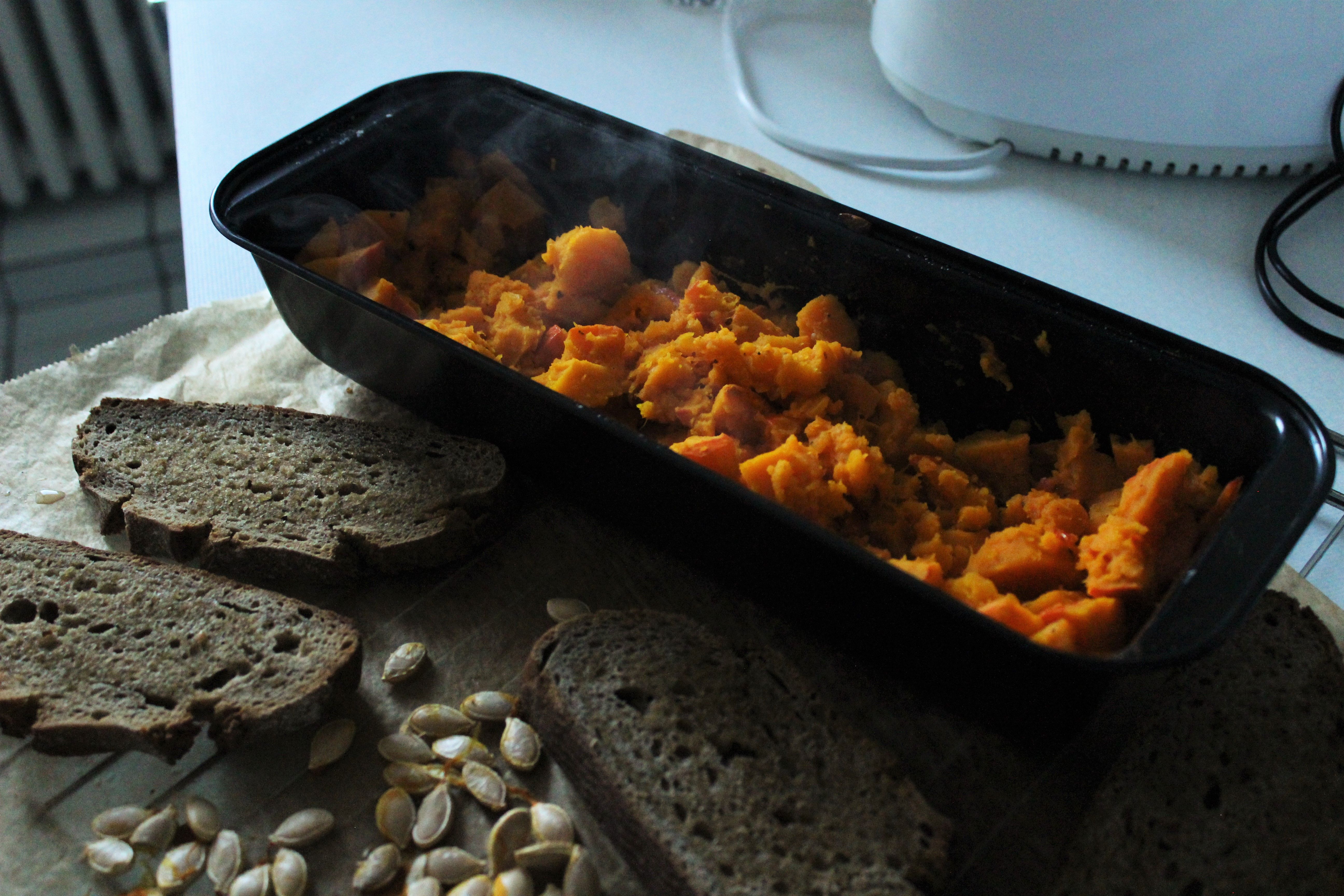 Statt Schafskäse habe ich bulgarischen Büffelkäse verwendet, der sehr weich, fast schon cremig ist, und vor allem salzig. Je nachdem, könnt ihr das Kürbispüree entsprechend weniger salzen. Natürlich könnt ihr auch mit anderen Gewürzen experimentieren. Ich bin mit meiner schlichten Version aber bereits sehr zufrieden! Und: Aus meinem kleinen Hokkaido-Kürbis ist eine ordentliche Menge an Püree entstanden, das mich definitiv einige Tage lang versorgen wird. Super!
