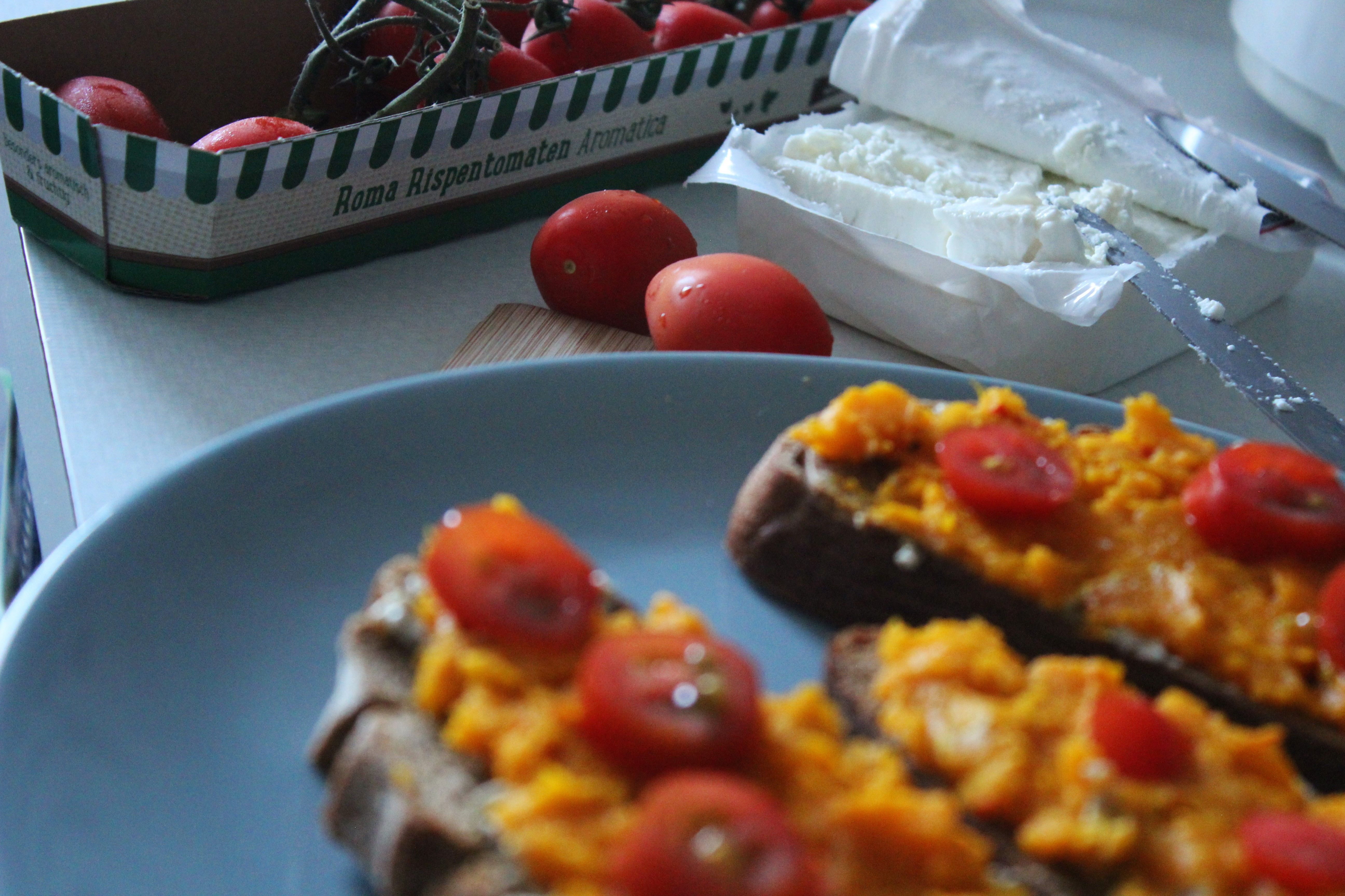 - Das geröstete Brot mit Frischkäse und darüber mit Kürbispüree bestreichen. Nach Belieben Feta zerbröckeln und das Brot damit und mit Cocktailtomaten servieren.
