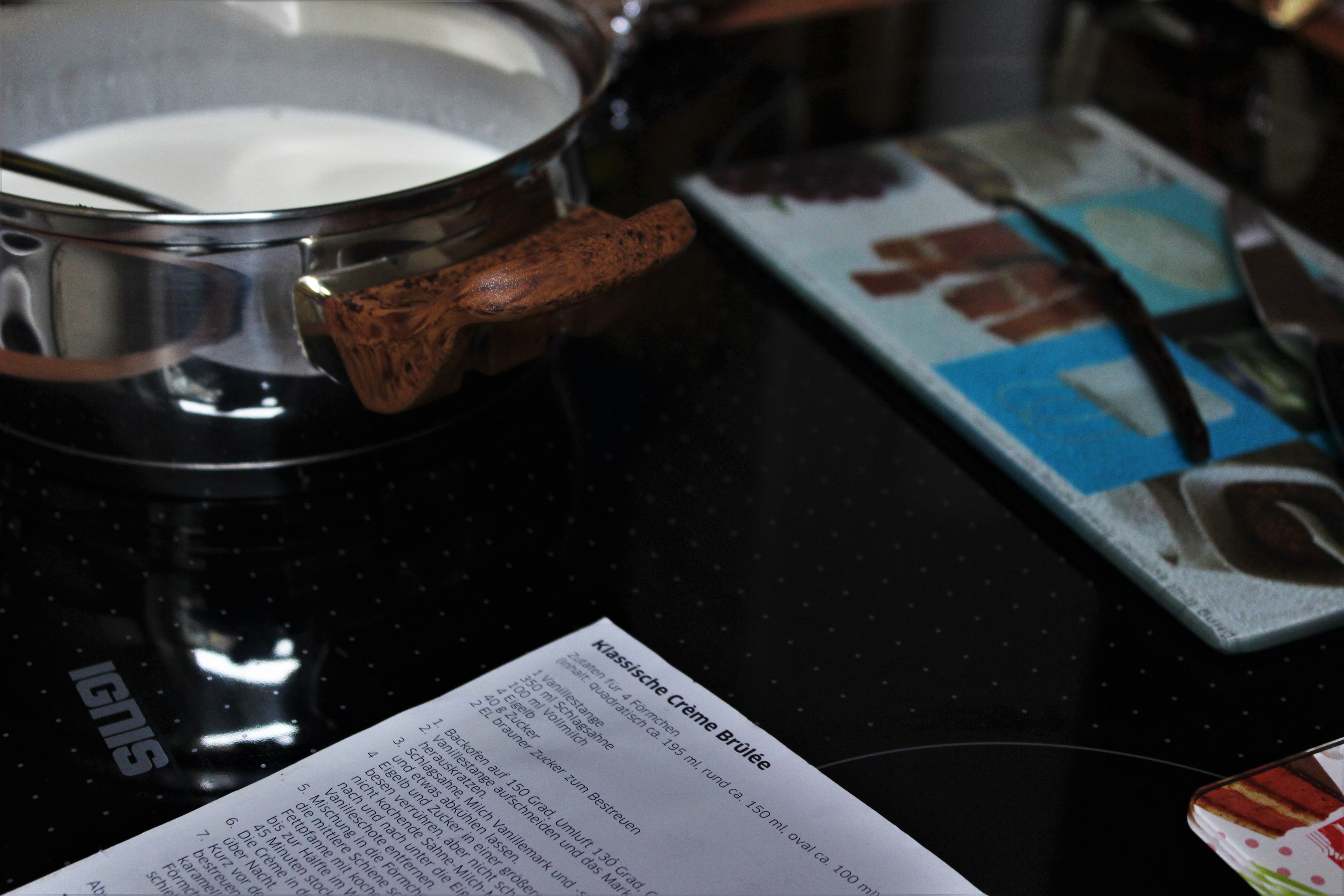 - Schlagsahne, Milch und Vanillemark und -schote zusammen aufkochen und etwas abkühlen lassen.