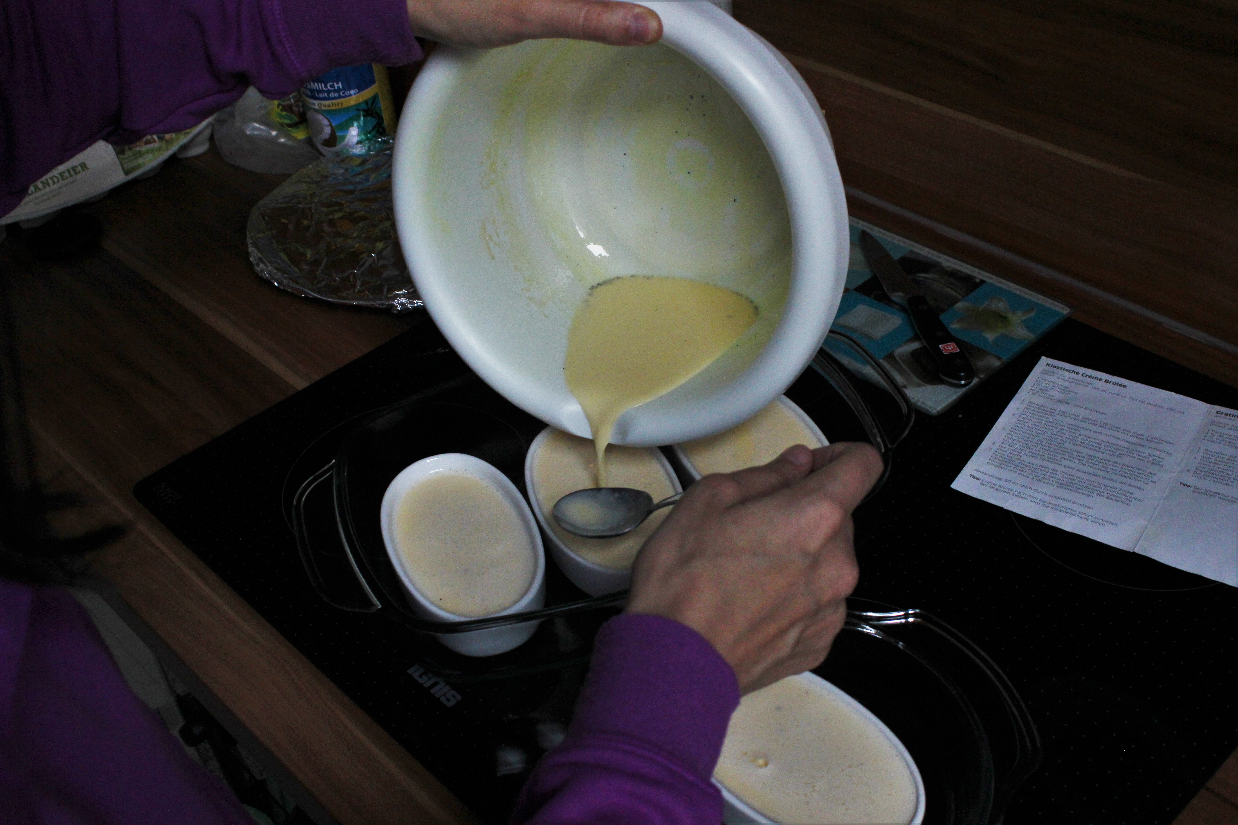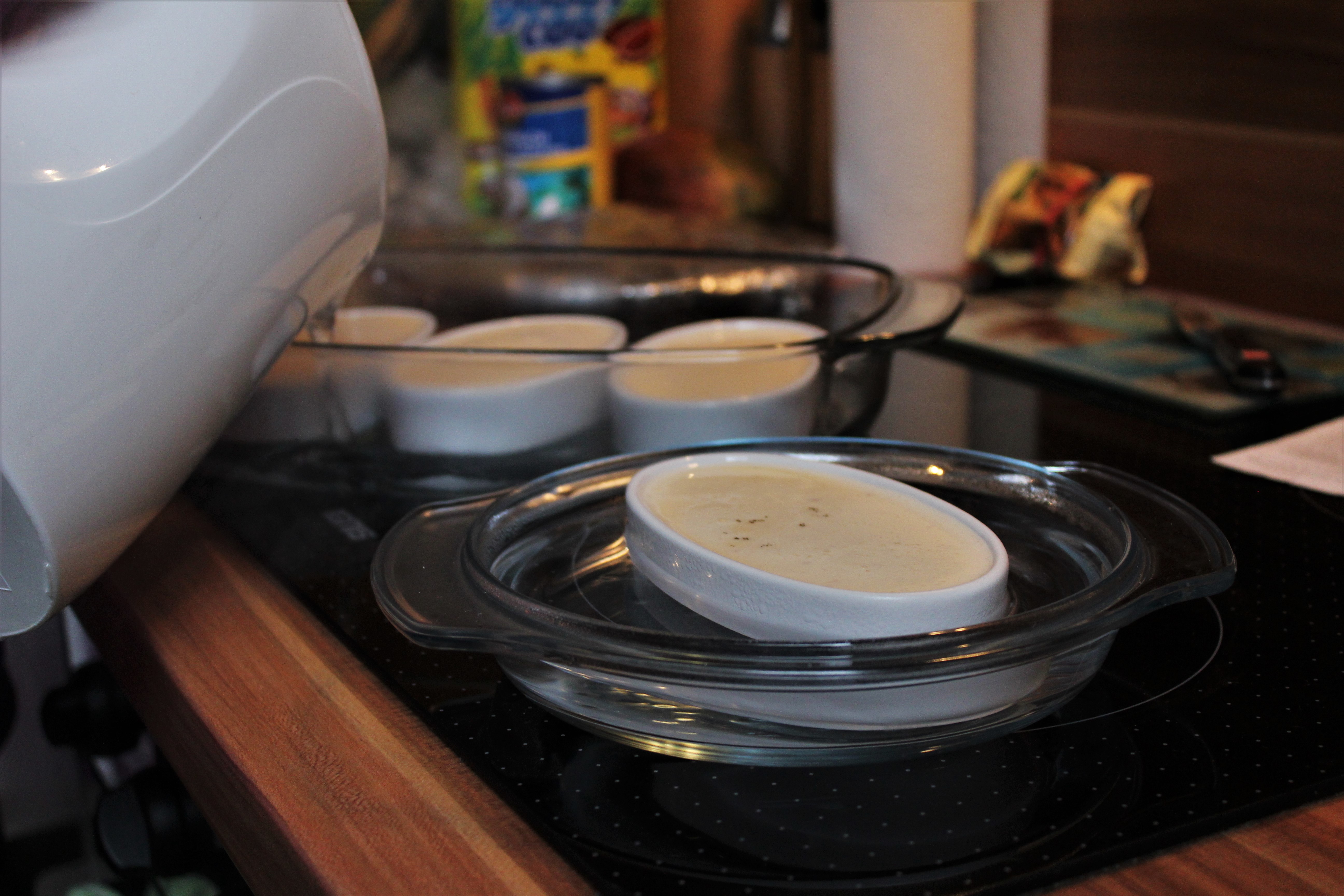 - Die Mischung etwa 45 Minuten lang im Ofen stocken lassen und die entstandene Crème in den Förmchen komplett (über Nacht) auskühlen lassen.