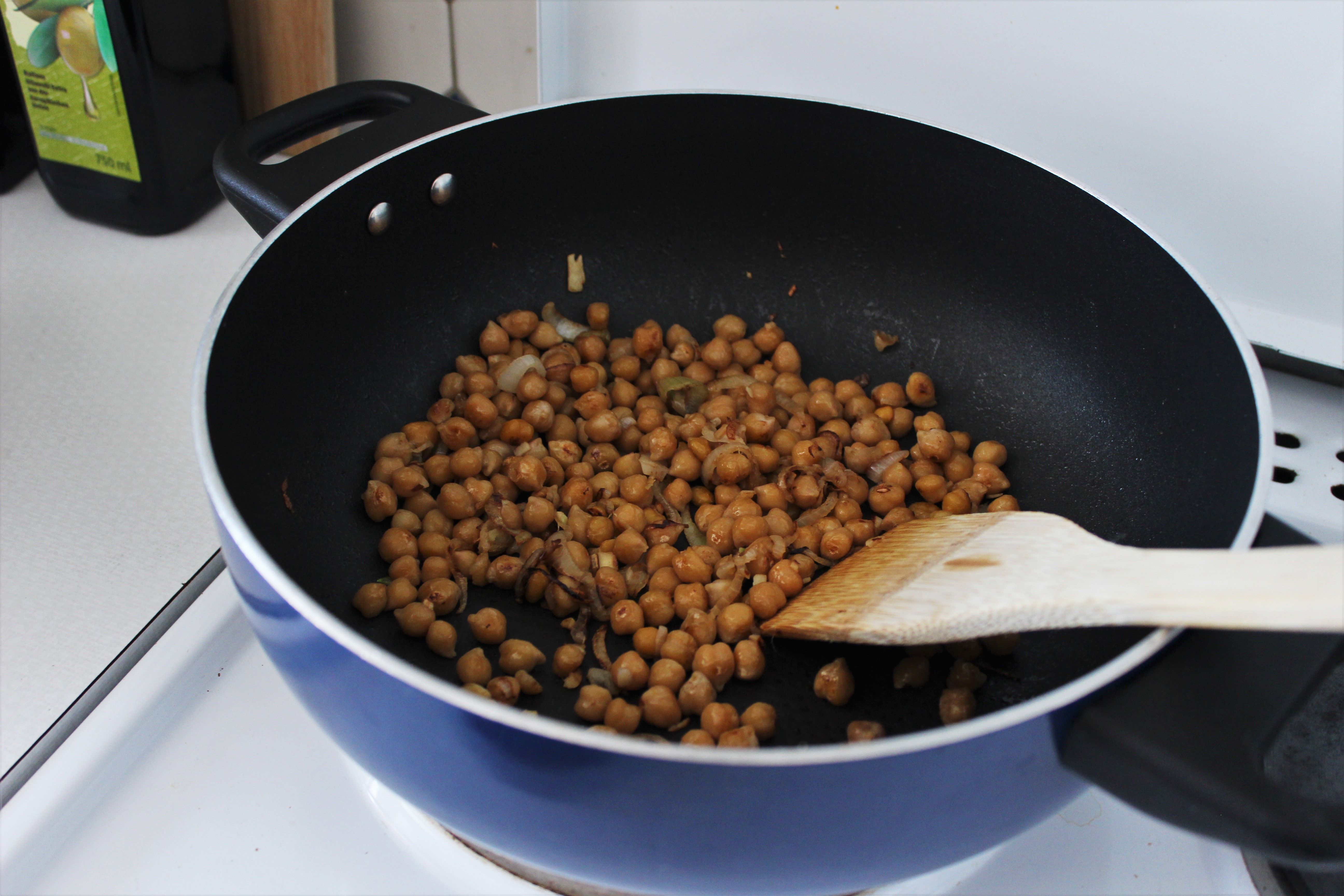 - Schalotte und Knoblauch schneiden/pressen und in einer Pfanne anbraten. Die Kichererbsen hinzugeben und zusammen etwa 5 Minuten dünsten. Mit Salz und Pfeffer abschmecken und zur Seite stellen.