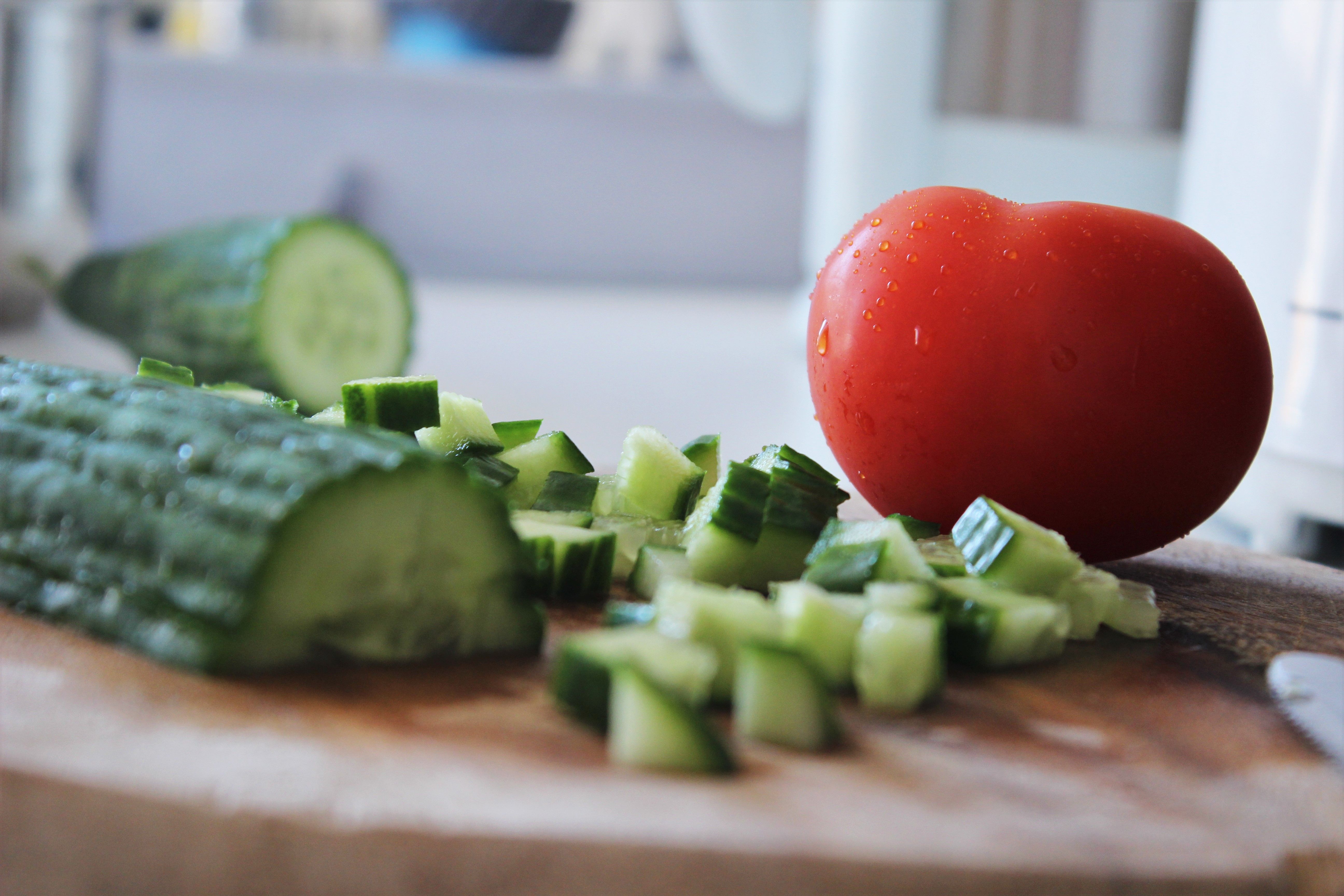 - Gurke, Tomaten und Oliven klein schneiden und unter die Kichererbsen mischen. Ggf. noch einmal mit Gewürzen und Kräutern abschmecken.