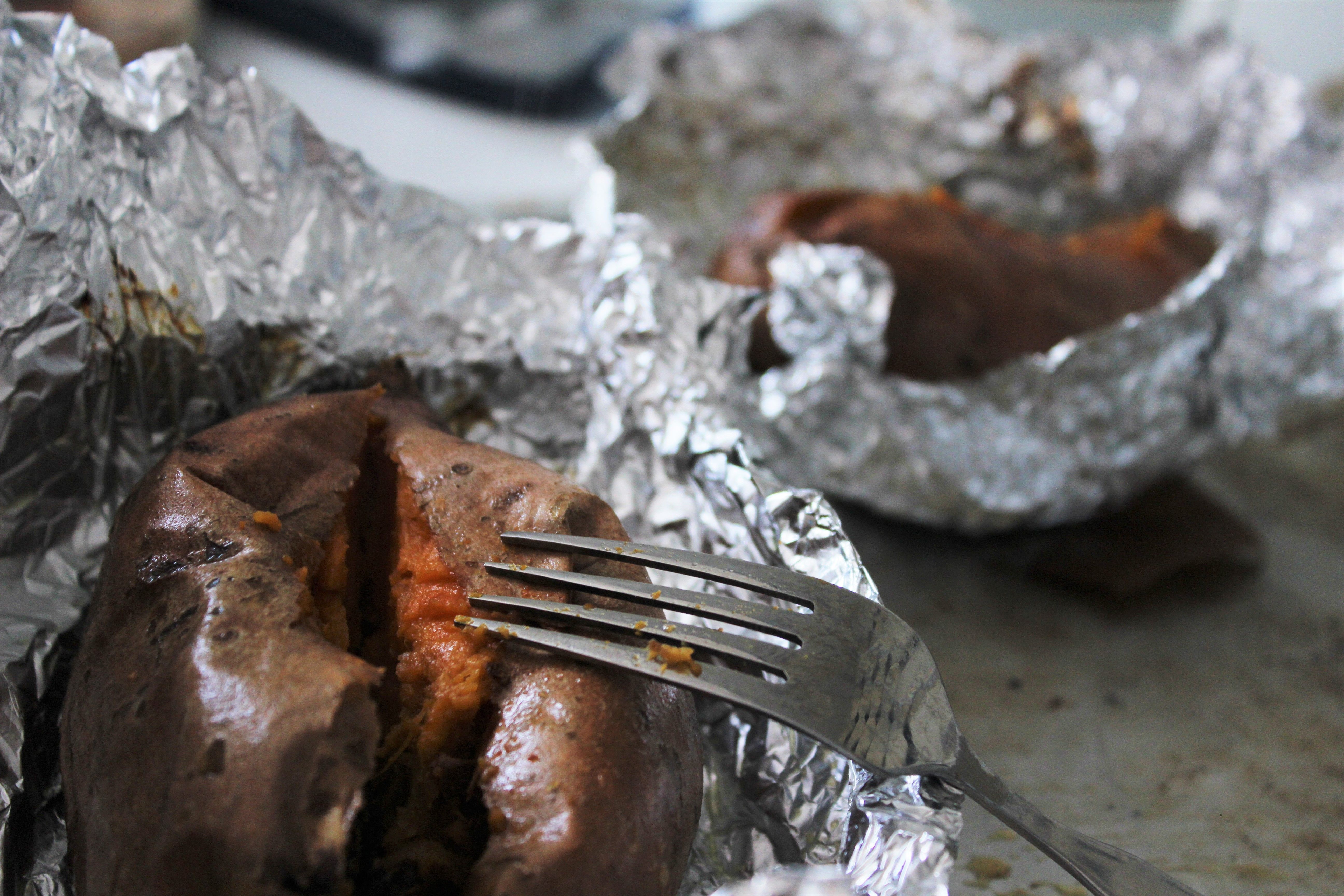 - Süßkartoffeln aus dem Ofen nehmen. Vorsichtig die Alufolie öffnen und sicherstellen, dass sie ausreichend weich gebacken sind. In der Mitte leicht aufschneiden und das Innere der Kartoffeln mit einer Gabel auflockern.