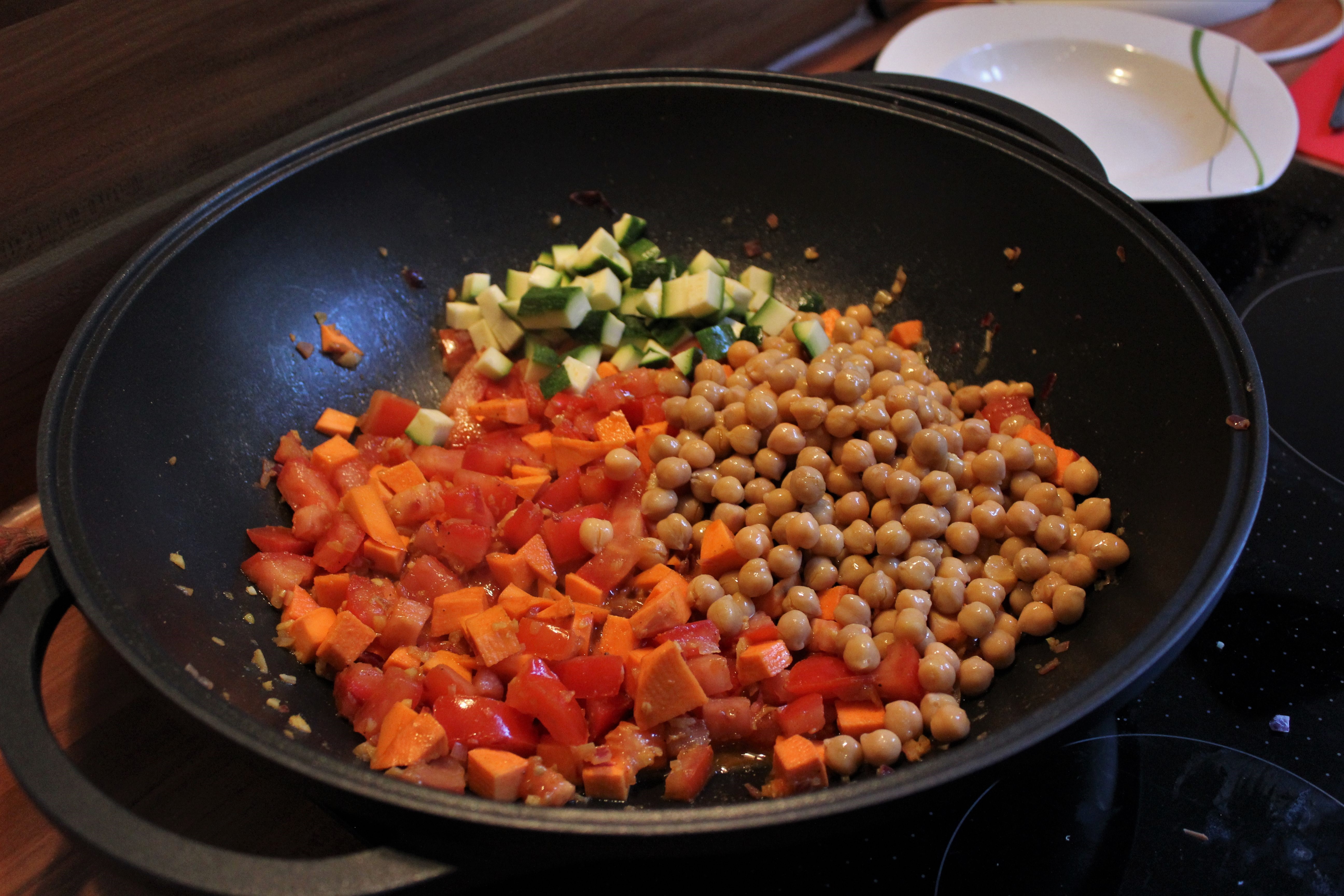 - Die gewürfelten Zutaten sowie die Kichererbsen zur Pfanne hinzufügen und alles für etwa 5 Minuten anbraten.